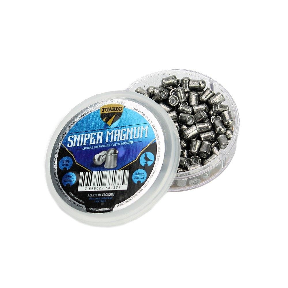 Chumbinho de Pressão Tuareg Sniper Magnum 5,5mmSua ponta arredondada permite a perfuração de objetos mais duros mesmo a longa distância. É Ideal para a prática do Field Target. Sua principal característica é a penetração, mas a precisão a média e longa distância merece destaque. Assim como todos os modelos da Chakal, sua produção é feita em um exclusivo sistema de injeção, que possibilita uma padronização comparada aos melhores chumbos do mundo. Especificações Técnicas: - Fabricante: Chakal - Calibre: 5.5mm (.22) - Modelo: Sniper Magnum - Quantidade: 125 unidades - Finalidade: Penetração