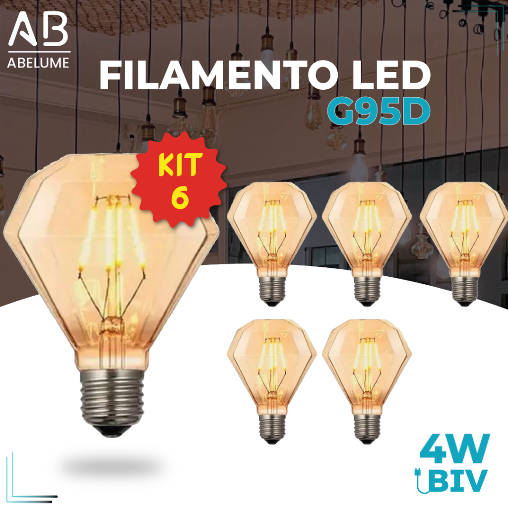 Kit 6 Lâmpada Filamento LED G95D 4W E27 LUZ QUENTE (AMARELO) Âmbar Retrô Vintage 110V~220V | Bivolt