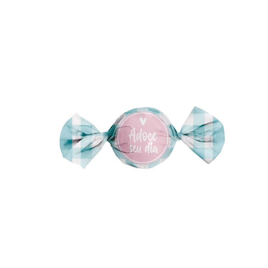 Embalagem pra Bombons e Trufas, na cor Xadrez Azul Turquesa, com decoração escrita ''Adoce seu dia'' em um círculo.