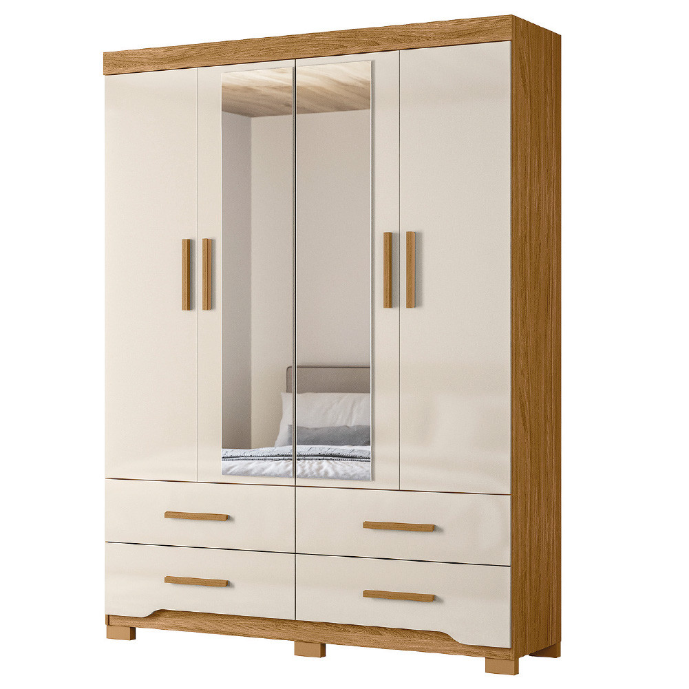 O Guarda Roupas Casal Miami é a solução perfeita para quem busca aliar estilo e funcionalidade. Conta com 4 portas e 4 gavetas - que possuem corrediças telescópicas e puxadores modernos -, oferece amplo espaço para armazenar roupas, cobertores, sapatos, acessórios e muito mais. Seu design inteligente permite a organização eficiente de roupas longas, graças aos cabideiros resistentes. As portas centrais, equipadas com espelhos, acrescentam funcionalidade e ampliam o ambiente, os puxadores são feitos de MDF, enquanto os pés de PVC proporcionam resistência e facilitam a limpeza. Confeccionado com materiais de qualidade garantindo maior durabilidade e resistência. MEDIDAS: A = 212 cm L = 157 cm P = 47 cm MEDIDAS DOS PÉS: A = 5 cm L = 10 cm P = 4 cm MEDIDAS DOS ESPELHOS: A = 140 cm L = 28 cm PESO DO PRODUTO: 114,89 kg PESO SUPORTADO: 72 kg PRATELEIRAS SUPORTAM ATÉ: 6 kg GAVETAS SUPORTAM ATÉ: 6 kg CABIDEIROS SUPORTAM ATÉ: 6 kg MODELO: Guarda Roupas Casal Com Espelho 4 Portas 4 Gavetas Miami MARCA: Moval COR: Madeirado / Off White PINTURA: UV ACABAMENTO: Fosco MATERIAL DA ESTRUTURA: MDP ESPESSURA DO MATERIAL DA ESTRUTURA: 12mm PORTAS: 4 TIPO DE PORTA: Bater DOBRADIÇAS: Metálicas GAVETAS: 4 CORREDIÇAS: Telescópicas PRATELEIRAS: 6 CABIDEIROS: 2 MATERIAL DO CABIDEIRO: Alumínio POSSUI ESPELHO: Sim, 2 unidades PUXADORES: 8 QUANTIDADE DE PÉS: 6 MATERIAL DOS PÉS: Plástico GARANTIA: 6 Meses ITENS INCLUSOS: 1 Guarda Roupa, 1 Manual de montagem, 1 Kit Parafusos INSTRUÇÕES E CUIDADOS: Para maior durabilidade, recomendável que a limpeza dos móveis seja feita com pano limpo e levemente umedecido em água e sabão neutro. Em seguida, deverá ser passado um pano limpo e seco. A Esplanada Móveis se responsabiliza pela entrega dos produtos adquiridos até a porta de entrada ou portaria do endereço indicado, se a portaria do condomínio permitir, as entregas são efetuadas no piso térreo e é de responsabilidade do cliente a locomoção da mercadoria até seu apartamento ou casa. Confira as dimensões do produto e certifique-se de que estão adequadas aos elevadores, portas e corredores do local da entrega. Não fazemos a montagem, desmontagem do produto e/ou portas e janelas, locomoção pela escada ou içamento pelo lado de fora do prédio. Não está incluso na entrega o deslocamento até o interior do apartamento, com ou sem elevador, ou deslocamento em locais de difícil acesso como escadarias. Caso o cliente necessite de entrega dentro das dificuldades mencionadas, deverá entrar em contato para análise e dúvidas. Certifique-se de tudo antes de finalizar a compra, evitando assim futuros desagrados ou imprevistos com a entrega.