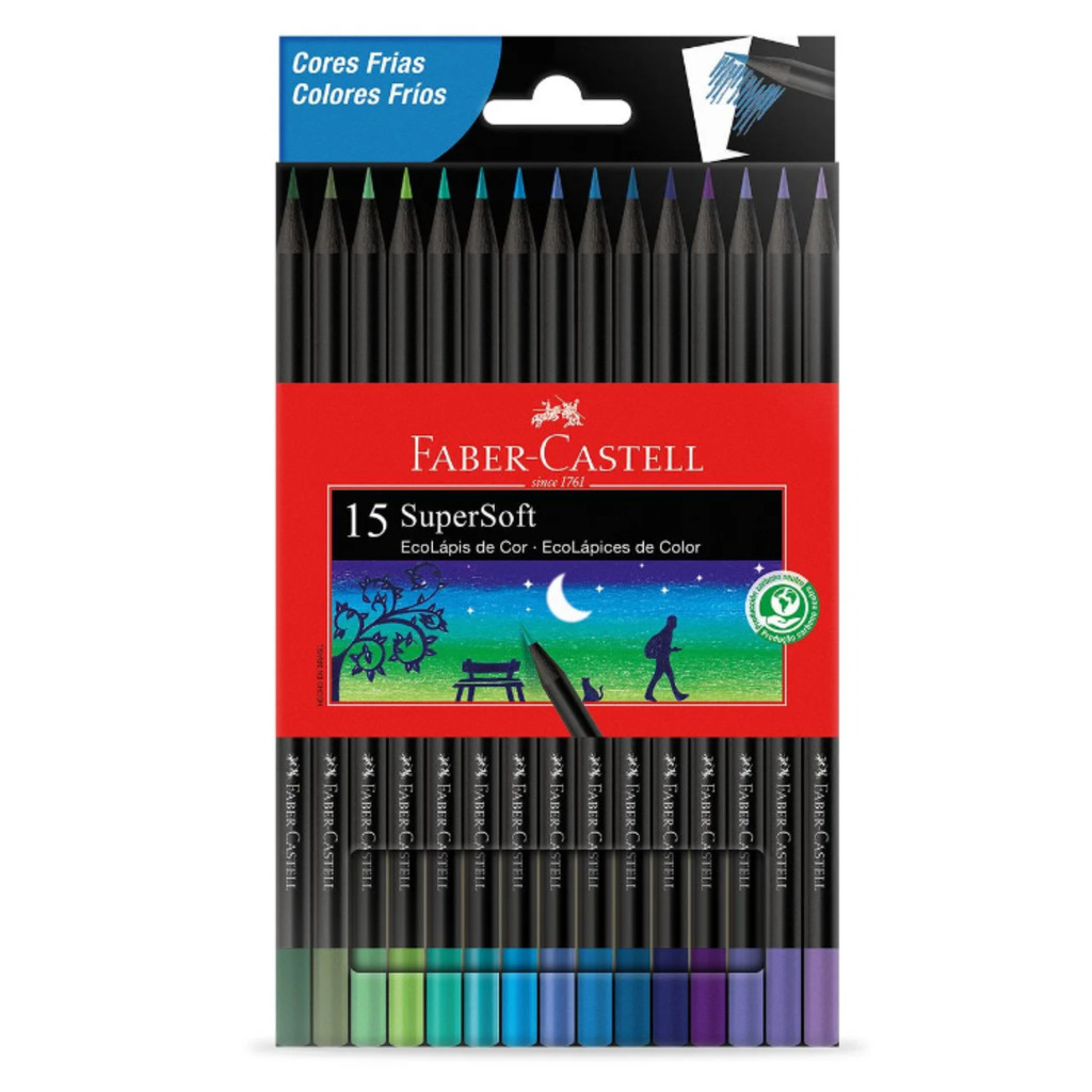 Super Soft 15 cores tons frios ¿ Mina Supermacia exclusiva, garantindo o máximo de conforto ao pintar. ¿ Cores mais vivas e excelente cobertura, sobre papéis claros e escuros. ¿ 15 cores tons quentes ¿ Produzido com madeira 100% reflorestada, certificada pelo FSC®: total respeito ao meio ambiente. Marca: Faber Castell; Referência:120715SOFTCF; Código: 483190; Características do Produto: Produzido com madeira 100% reflorestada, certificada pelo FSC®; Embalagem: 1 Estojo Com 15 Cores