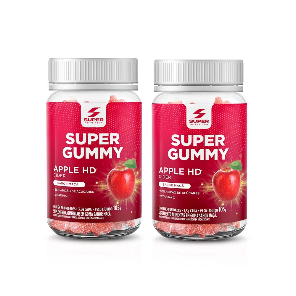 Você vai amar esta novidade: Super Gummy Apple HD, o novo suplemento em gomas da Super Nutrition. O que é Super Gummy Apple HD ? São gomas feitas a base de Vinagre de Maçã Vitamina C, que proporcionam inúmeros benefícios com delicioso sabor de Maçã. Benefícios da Vitamina C ✓ A vitamina C auxilia na absorção de ferro dos alimentos. ✓ A vitamina C é um antioxidante que auxilia na proteção dos danos causados pelos radicais livres. ✓ A vitamina C auxilia no funcionamento do sistema imune. ✓ A vitamina C auxilia na formação do colágeno. ✓ A vitamina C auxilia na regeneração da forma reduzida da vitamina E. ✓ A vitamina C auxilia no metabolismo energético. ✓ A vitamina C auxilia no metabolismo de proteínas e gorduras. PERGUNTAS FREQUENTES Quando devo consumir o produto?Consumir duas (2) balas ao longo do dia. De preferência, manter o consumo sempre no mesmo horário. Posso comer mais de uma goma ao dia?Recomendamos que seja ingerido duas gomas ao dia para atingir a dose recomendada conforme informação nutricional. O produto quebra jejum?Sim, embora o produto seja baixo em valor energético há um aporte nutricional que interfere no jejum. Qual ingrediente está encobrindo as gomas?O pó que está na cobertura das gomas é o maltitol. O que é maltitol?É um poliol extraído a partir do milho, chamado de edulcorante ou adoçante e tem a função de substituir o açúcar refinado (sacarose), evitando que seja adicionado açúcar ao produto e controlando a quantidade de calorias presentes. O produto é vegano?Não podemos afirmar, pois não temos o selo de comprovação; porém todos os ingredientes da fórmula não são de origem animal.