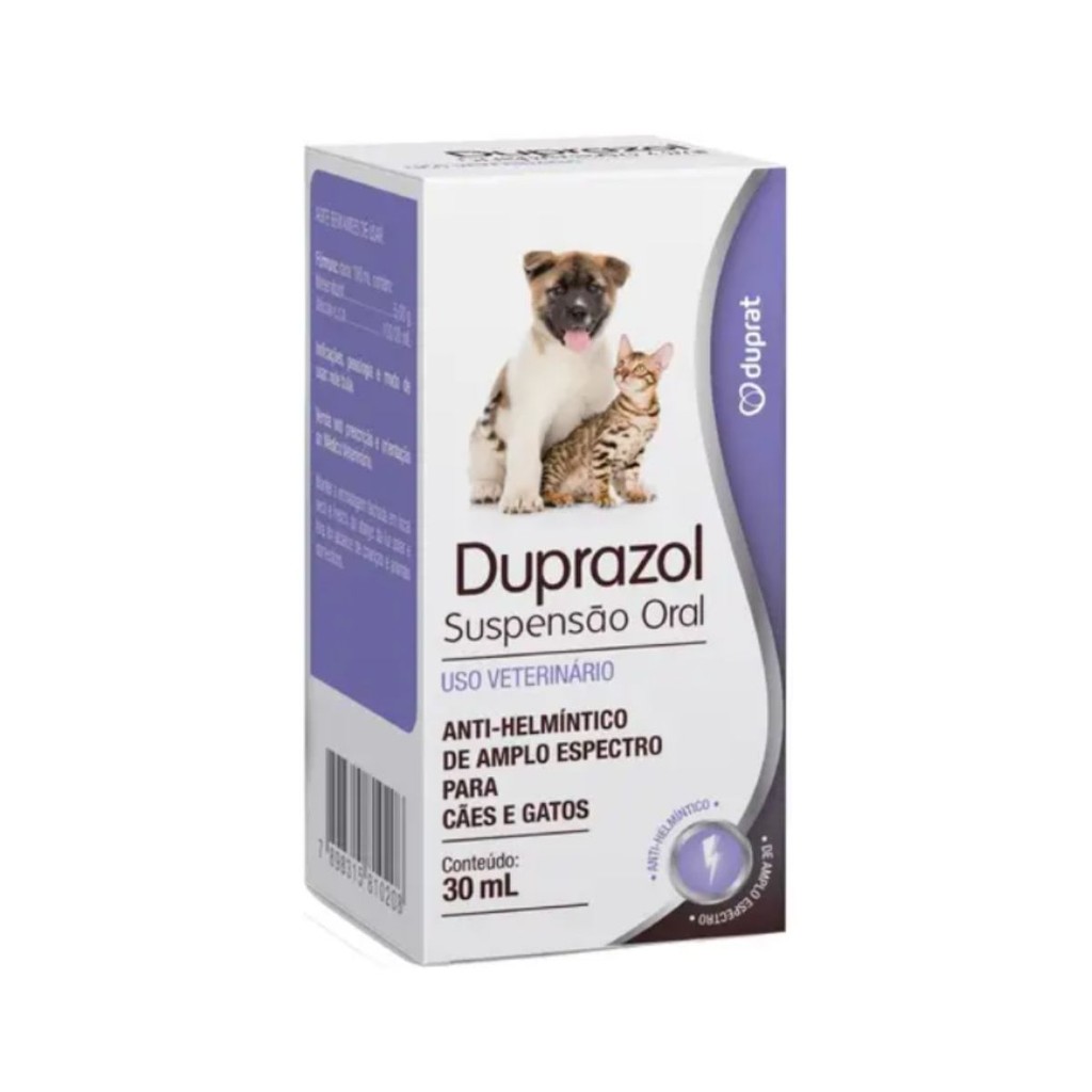 A MANADA ANIMAL é um marketplace de produtos veterinários. É a escolha certa para tutores que prezam pela qualidade dos produtos que seu animal necessita. Tudo com o suporte de uma equipe de veterinários e gestores com mais de 10 anos de experiência no mercado. Fique tranquilo, todos os nossos produtos são originais, adquiridos através de distribuidores credenciados! Ah, e todas as vendas acompanham nota fiscal! MANADA ANIMAL, Tranquilidade pra você, cuidado para ele! ____________________________________________________________ Descrição O Anti-Helmintico Duprat Duprazol para Cães e Gatos é caracterizado por seu amplo espectro de ação anti-helmíntico, tendo 95% de eficácia contra a Ascaridíase, Tricuríase e Ancilostomíase, que afetam os animais. Sua atividade estende-se também contra as teníases (T. hydatigena, T. pisiformis, H. taeniformis) que afetam cães e gatos, exceto D. caninum. Indicações/Recomendações: Não pode ser administrado em animais prenhes, sob o risco de ter embriotoxicidade e teratogenia. * Consulte sempre o Médico Veterinário de sua confiança para o uso apropriado deste produto. Leia a bula ou informações descritas na embalagem. * - Mebendazol - Suspensão Oral, para cães e gatos - Elimina Ascaridíase, Tricuríase e Ancilostomíase - Consulte o médico veterinário de sua confiança.