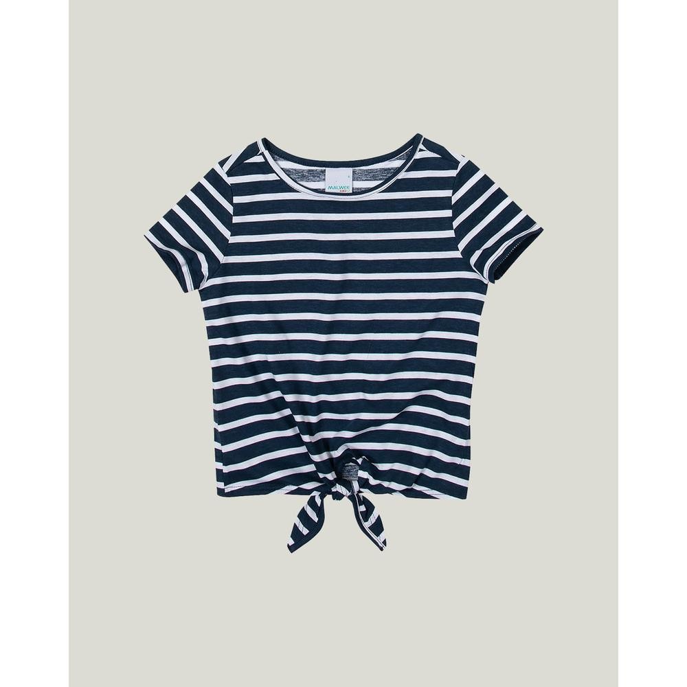 Blusa confeccionada em meia malha. Modelagem tradicional, que acompanha as linhas do corpo com muito conforto. Modelo com decote redondo e manga curta. Detalhe de amarração. Estampa corrida de listras. Uma peça cheia de charme para o dia-a-dia da sua pequena. Invista com short da mesma estampa e tênis flatform. Modelagem: Tradicional Manga: Curta Decote: Redondo