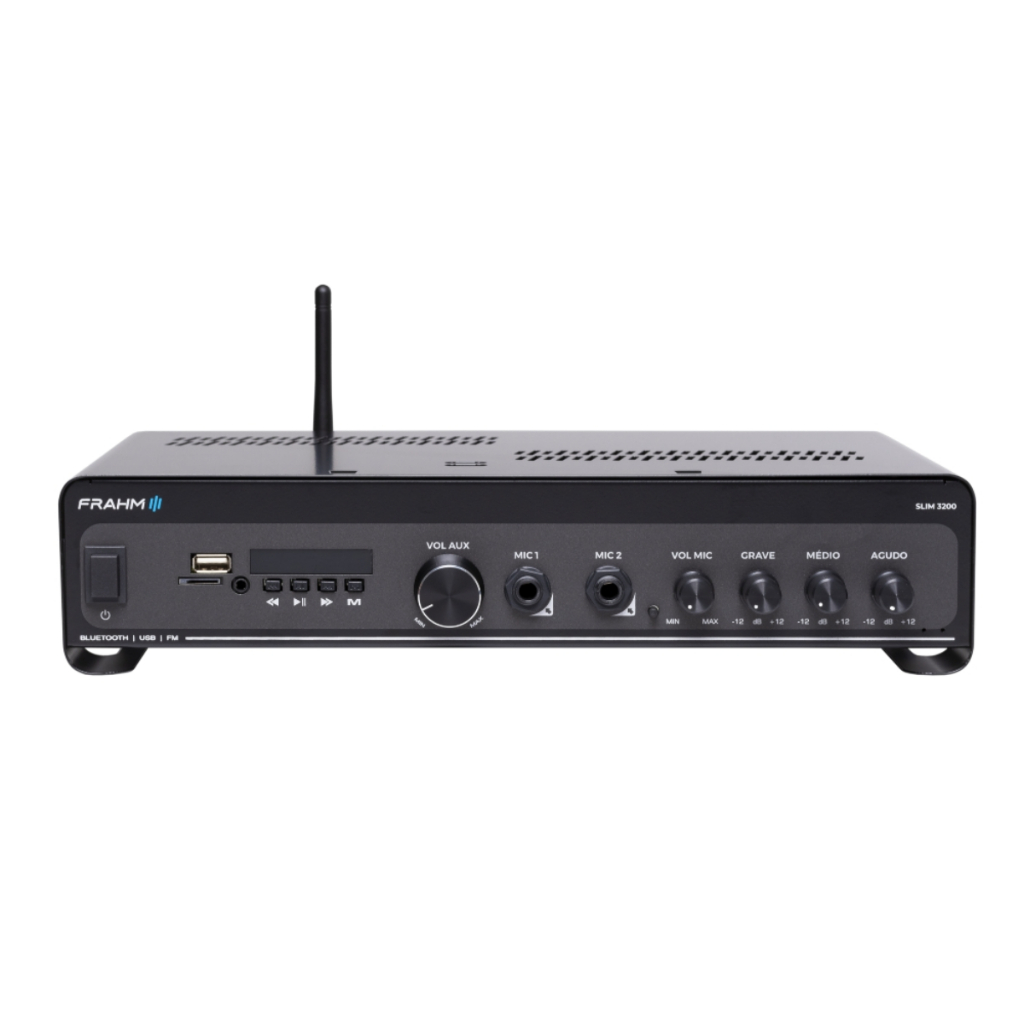 A linha nº1 em amplificador comercias do Brasil, chega em sua quinta geração (G5), trazendo ainda mais tecnologia e um visual único e inovador. Geração que reflete toda a confiabilidade, sem perder sua essência. INDICAÇÃO DE USO • Restaurantes, conveniências, farmácias, lojas, clínicas, ambientes corporativos, mercados/supermercados e muitos outros. • Amplificador que pode sonorizar um ambiente de fácil modo com ótima potência, pois possibilita a instalação de até 2 caixas de 8 ohms em paralelo ou múltiplas caixas através de associação. BENEFÍCIOS • Visual único e moderno; • Facilidade em sua operação. Conteúdo da Embalagem • 01Amplificador Slim 3200 Optical G5 • 01Controle remoto para o dispositivo • 01Antena Bluetooth • 02Pilhas AAA • 01Manual de instruções Informações Técnicas • Potência: 200W RMS @ 4 Ohms • Amplificador: Classe AB • Número de canais saída: 1 canal (Mono) • Conexões de entrada 1: USB / FM / MicroSD / Óptico / BT / P2 • Conexões de entrada 2: Entrada auxiliar 2x (RCA) • Conexões para MIC: 2x (P10) • Sensibilidade do AUX: 300m VRMS @ 1KHz • Impedância do AUX: 16K Ohms • Sensibilidade do MIC: 13m VRMS @ 1KHz • Impedância do MIC: 1K1 Ohms • Impedância do AUX: 16K Ohms • Bivolt automático: 90-240V • Consumo máximo: 280W Dimensões • Altura:7,6cm • Largura:33,7cm • Comprimento:26cm • Peso: 2,7 Kg