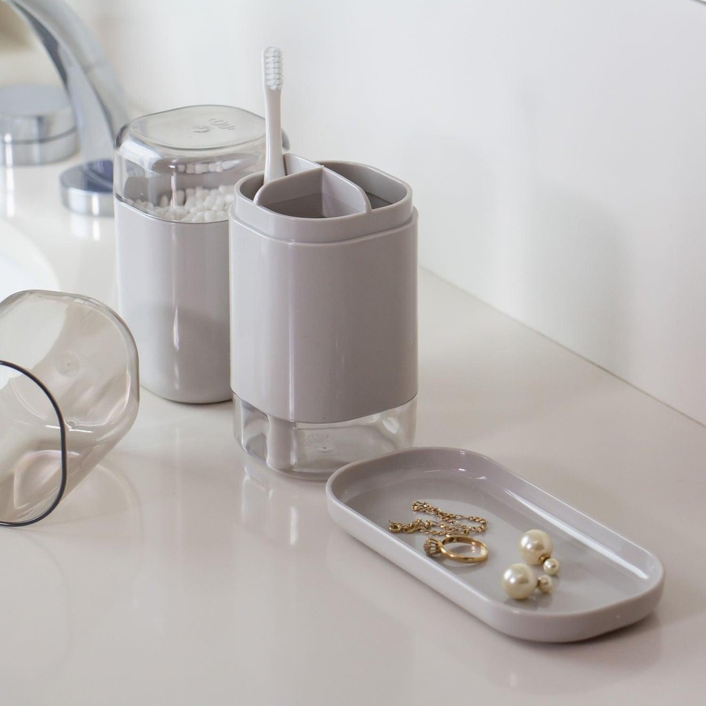 A Bandeja Dual é o toque de delicadeza e a particularidade de todos os elementos da linha. Organizando com praticidade o ambiente, trazendo a sensação de equilíbrio. Além de possuir apoios feitos para evitar que os produtos entrem em contato com a água, caso a bancada fique molhada. Assim, os itens ficam protegidos e sempre prontos para uso.A linha é fabricada em material resistente (Plástico PS) com design imponente e ergonômico, linhas suaves e núcleos que vão trazer mais vida para o seu banheiro são as características da linha Dual feitas para deixar seu banheiro mais Ou.