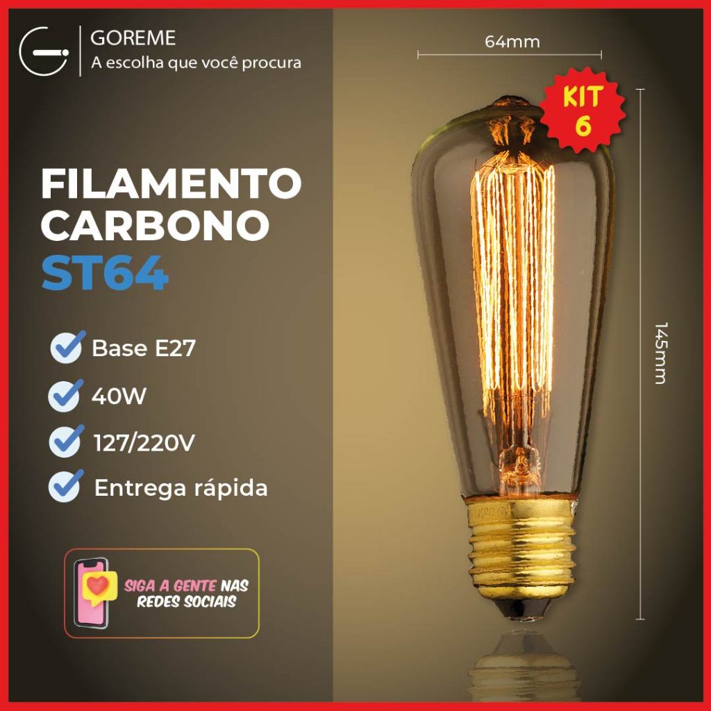 Kit 6 Lâmpada Filamento Carbono ST64 40W E27 LUZ QUENTE (AMARELO) Âmbar 110V~220V