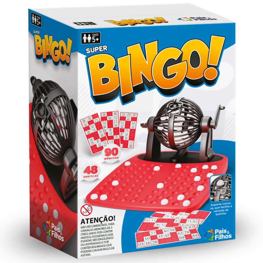 ***PRODUTO PAIS E FILHOS EM PORTUGUÊS, ORIGINAL, OFICIAL, LACRADO E COM NOTA FISCAL*** JOGO SUPER BINGO 90 NÚMEROS 48 CARTELAS PAIS E FILHOS FAMÍLIA CRIANÇA GLOBO BOLINHAS NUMERADAS GIRAR Informações Técnicas: - Material: Papel Cartão e Resina Termoplástica. - Contém: 1 globo, 1 base plástica, 90 números e 48 cartelas. - EAN: 7908470012994 - Código: 791299 - Produto certificado: INMETRO REGISTRO: 003723/2019 - Dimensões: 24cm x 13cm x 33cm - Peso: 516g - JOGO - 5+ ANOS - PAIS E FILHOS - Garantia: Contra defeitos de fabricação - Prazo de Validade: Indeterminado Obs: O tamanho de cada peça pode sofrer variações. Imagens meramente ilustrativas. O produto e as cores podem variar de acordo com o apresentado na embalagem. ATENÇÃO! NÃO RECOMENDÁVEL PARA CRIANÇAS MENORES DE 3 (TRÊS) ANOS POR PODER GERAR PARTE(S) PEQUENA(S) QUE PODE(M) SER ENGOLIDA(S) OU ASPIRADA(S). COMO JOGAR 1 - Cada jogador pega uma cartela do Bingo e um jogador ficará de Crupiê (responsável por girar o globo e anunciar as bolinhas sorteadas) *Cada cartela possui 15 números, distribuídos em 3 linhas de 5 números. 2 - O Crupiê, deverá girar o globo em sentido horário. Depois que o globo parar, uma bolinha deverá ser retirada, informada em voz alta e colocada no quadro de números (para facilitar a conferência do vencedor do Bingo) *Se a bolinha enroscar, segure a alça e gire no sentido horário para empurrar a bolinha para o suporte. 3- O jogador que tiver um de seus números lido pelo Crupiê, poderá marcar esse em sua cartela. *Sugestão: usar feijões ou pedrinhas para marcar as cartelas ao invés de riscá-las com caneta ou lápis. 4 - O jogo seguirá dessa maneira, repetindo os passos 2 e 3. 5 - Vence o jogador que preencher uma das linhas horizontais da cartela e/ou a cartela inteira. --------------------------------------------------- SEJA MUITO BEM VINDO(A) A LOJA DE BRINQUEDOS DO CANAL 40 POR QUÊ COMPRAR NA LOJA DE BRINQUEDOS DO CANAL 40? *Enviamos seu pedido sempre no mesmo dia ou no máximo no próximo dia útil dependendo do horário da sua compra! *Produtos lacrados, originais e oficiais da mais alta qualidade; *Experiência única de compra (incluindo a experiência olfativa - você sentirá nosso cheiro); *Todos os nossos produtos estão à pronta entrega em nosso estoque físico aqui no Brasil; *Seu pedido será enviado com segurança e agilidade; IMPORTANTE: Tenha tranquilidade de comprar com quem está disposto a te oferecer o melhor atendimento, caso tenha algum problema após a compra, conte com nossa equipe de pós venda para solucioná-lo! A LOJA DE BRINQUEDOS DO CANAL 40 tem a missão de garantir a satisfação total do seu cliente, tanto nos produtos quanto no atendimento. Assim estabelecemos uma relação única de confiança! Não encontrou o que procurava? Clique na foto da nossa logo para entrar em nossa loja e ver todos os nossos produtos OU nos mande uma mensagem diretamente aqui pelo chat. SERÁ UM PRAZER ATENDÊ-LO(A)! --------------------------------------------------- MUITO PRAZER, ME CHAMO FELIPE CAMARGO, SOU DONO, CEO E CRIADOR DE CONTEÚDO DO CANAL 40. DESDE JÁ, DEIXO AQUI O MEU MUITO OBRIGADO!!! CANAL 40 - LOJA DE BRINQUEDOS LTDA DEIXE SUA CRIANÇA INTERIOR FELIZ E APROVEITE!