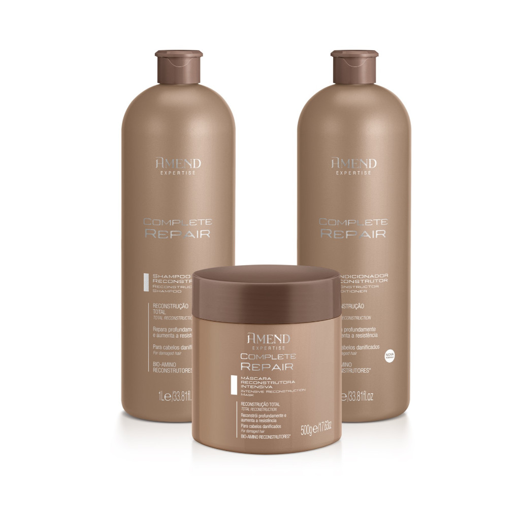 SHAMPOO RECONSTRUTOR AMEND EXPERTISE COMPLETE REPAIR 1 LITRO Shampoo Reconstrutor Amend Expertise Complete Repair limpa os fios suavemente. Com bio-aminio reconstrutores que agem na reparação profunda e resgate da vitalidade, resistência e brilho. Cabelos sedosos e protegidos de danos futuros. MÁSCARA RECONSTRUTORA AMEND EXPERTISE COMPLETE REPAIR 500G Máscara Reconstrutora Amend Expertise Complete Repairage no interior da fibra capilar. Com bio-amino reconstrutores que reparam danos, reconstroem as áreas fragilizadas e aumentam a resistência dos fios à quebra. Protege os cabelos de danos futuros. CONDICIONADOR RECONSTRUTOR AMEND EXPERTISE COMPLETE REPAIR 1 LITRO Condicionador Reconstrutor Amend Expertise Complete Repair que condiciona, hidrata e reduz o frizz. Com bio-amino reconstrutores que agem na reparação profunda e resgate da vitalidade, resistência e brilho. Cabelos sedosos e protegidos de danos futuros. c CONDICIONADOR RECONSTRUTOR AMEND EXPERTISE COMPLETE REPAIR 1L Condiciona, hidrata e reduz frizz. PRINCÍPIOS ATIVOS SHAMPOO RECONSTRUTOR AMEND EXPERTISE COMPLETE REPAIR 1L Bio-Amino Reconstrutores, Bioativo Positivo. Sem Sal. MÁSCARA RECONSTRUTORA AMEND EXPERTISE COMPLETE REPAIR 500G Bio-Amino Reconstrutores, Bioativo Positivo. CONDICIONADOR RECONSTRUTOR AMEND EXPERTISE COMPLETE REPAIR 1L Bio-Amino Reconstrutores, Bioativo Positivo. COMO USAR SHAMPOO RECONSTRUTOR AMEND EXPERTISE COMPLETE REPAIR 1L Aplicar nos cabelos molhados, massageando os fios com as pontas dos dedos. Enxágue e repita a operação. MÁSCARA RECONSTRUTORA AMEND EXPERTISE COMPLETE REPAIR 500G Após lavar os cabelos com o shampoo, retire o excesso de água com uma toalha e aplique a máscara do comprimento dos fios até as pontas, massageando mecha por mecha. Deixe agir por 5 minutos. Enxágue bem. Se desejar, aplique a seguir o condicionador para selar as cutículas. CONDICIONADOR RECONSTRUTOR AMEND EXPERTISE COMPLETE REPAIR 1L Aplicar nos cabelos molhados, após o uso do shampoo ou da máscara. Evitar aplicar na raiz. Massageie os fios suavemente e enxágue bem.