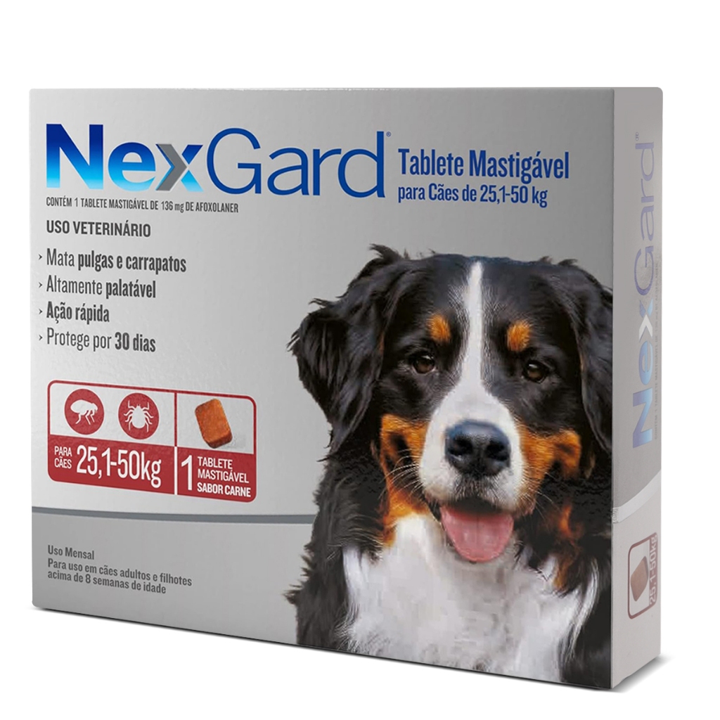O Medicamento NexGard é a solução ideal para o tratamento e prevenção mensal de infestação por pulgas, carrapatos e piolhos, unindo eficácia e segurança à facilidade de administração de um tablete macio e com um delicioso sabor carne. Recomendado para todas as raças a partir de 8 semanas, possui ação rápida, fácil administração e protege por até 30 dias. ATENÇÃO Adquira o produto de acordo com o peso de seu cão. Idade mínima 8 semanas. O PRODUTO É ORIGINAL? 100% original, com comprovada eficácia. PERGUNTAS FREQUENTES 1- COMO NEXGARD MATA PULGAS? O princípio ativo de NexGard, afoxolaner, mata as pulgas através da hiperexcitação. 2- Em quanto tempo NexGard elimina pulgas e carrapatos? NexGard mata 87,8% das pulgas em até 4 horas e atinge 100% de eficácia dentro de 6 horas. Frente aos carrapatos, após 48 horas de administração, 100% destes são eliminados 3- Por que vejo mais pulgas no meu cão após administrar NexGard? NexGard causa hiperestimulação das pulgas, fazendo com que subam para a extremidade do pelo enquanto morrem. 4- Qual é o prazo de validade de NexGard? NexGard é válido por um período de 24 meses a partir da data de fabricação. A data de validade pode ser verificada na embalagem do produto. 5- O banho interfere na ação de NexGard? Como NexGard é um produto de uso oral, banhos ou quaisquer atividades na água não interferem na eficácia ou período de ação. 6- Meu cão pode utilizar NexGard se estiver sob efeito de outros medicamentos? Em um estudo de campo, NexGard foi administrado em conjunto com anti-helmínticos, antibióticos, vacinas, corticoesteróides, anti-inflamatórios não esteroidais (AINEs) e outros produtos veterinários usados frequentemente. O resultado do estudo demonstrou que as medicações administradas concomitantemente não impactaram a segurança ou a eficácia de NexGard. 7- É seguro utilizar NexGard em quaisquer raças de cães? NexGard é seguro e eficaz em quaisquer raças de cães quando utilizado conforme as recomendações. 8- NexGard pode ser usado em outras espécies de animais? NexGard somente deve ser utilizado em cães. 9-Posso administrar NexGard com intervalo menor do que 30 dias? NexGard atua por um período de 30 dias. Não se recomenda redução do intervalo de administração. 10- Qual é a idade mínima para uso seguro de NexGard? NexGard pode ser administrado em cães a partir de 8 semanas de idade e 2 kg. 11- Quais são os possíveis efeitos adversos do uso de NexGard? NexGard é recomendado apenas para cães. Seu uso em cadelas prenhes, lactantes ou em reprodução não foi testado. Efeitos adversos podem incluir: vômito, pele seca ou descamativa, diarreia, letargia e falta de apetite. Deve-se utilizar com cautela em cães com histórico de convulsões.