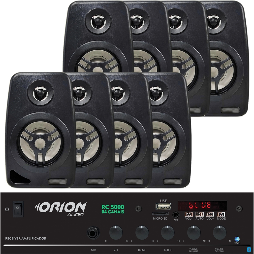 Mais de 15 anos de experiência no mercado com os melhores produtos e o melhor atendimento! Kit Som Ambiente Amplificador Receiver Rc5000 300w Orion Bluetooth Usb Micro SD Auxiliar Rca Fm 2 Canais de 150W 4 Ohms Entrada P10 + Caixas de Som Ambiente com Suporte para Parede 4 Polegadas 55w 8 Ohms Pretas Compatível com ALEXA e GOOGLE ASSISTENTE Amplificador para Som Ambiente Bluetooth USB/FM/Micro SD/ 1 Entrada de Microfone Equalizador Bass e Treble - 120W 4 Canais - 4 Ohms Orion RC5000 O amplificador Orion RC5000 é compacto, com equalizador de graves e agudos, versátil e desenvolvido para oferecer alto desempenho e qualidade de reprodução em todas as faixas de áudio. Com controles de volume dedicados, entrada auxiliar e entrada para microfone, ele é perfeito para projetos de som em diversos ambientes, como igrejas, escolas, hotéis, supermercados, bares, lojas e consultórios. Com este amplificador, você pode desfrutar de suas músicas com excelente qualidade sonora. Ele possui 480 Watts de potência máxima (PMPO) e é bivolt automático, garantindo fácil instalação e operação confiável. Principais recursos: Conexões versáteis: USB, SD, RCA, FM e Bluetooth. Praticidade: Controle remoto incluso para ajustar o som à distância. Capacidade: 4 saídas de áudio que suportam até 16 alto-falantes (consultar manual para instalação correta). Entrada: 1 entrada P10 para microfone ou instrumento. Controle equalizador de Graves e agudos. Especificações técnicas: Potência RMS: 120W Potência máxima PMPO: 480W Impedância mínima: 4 Ohms Tensão: Bivolt automático (110V/220V) Entradas: SD, USB, RCA, Bluetooth Saídas: 4 canais de áudio borne, 1 saída RCA Dimensões: Largura: 24,5 cm Profundidade: 16,5 cm Altura: 7 cm Caixas de Som Ambiente com Suporte para Parede 4 Polegadas 55w 8 Ohms Orion Caixas passivas de Som da Orion Áudio com alto-falante de 4 polegadas, reproduzindo som com até 55W de potência RMS. É uma ótima opção para potencializar o som ambiente, podendo ser facilmente instaladas com paredes e colunas e posicionadas de acordo com suas necessidades. Ligação por fio paralelo 0,50mm acima (não incluso) Características técnicas da caixa de som: Cor: Preta Woofer de 4 Polegadas Potência: 55W RMS Impedância: 8 Ohms Sensibilidade: 84 Db Resposta de frequência: 37 a 20000Hz Bobina simples Carcaça em Plástico Resistente ABS Possui Ajuste de Direção e Suporte multi-posição Ótimo Acabamento Pode ser usada na parede, teto ou usar sem suporte em uma mesa, estante, rack. etc... Dimensões de 1 Caixa: - 20,5 cm Altura - 13 cm Largura - 8,5 cm Profundidade Conteúdo da Embalagem: 1 - Receiver RC 5000 BT ORION 1 - Controle 8 - Caixas de som + suportes de fixação