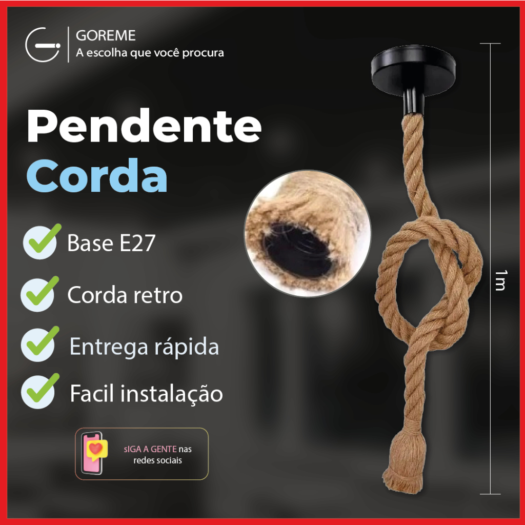 🌟💡 Luminária Pendente de Corda 💡🌟 Características: 💡 POTÊNCIA: Suporta até 40W 🔌 TENSAO: AC85-265V 🌐 IP: IP20 (Uso interno) 📅 GARANTIA: 1 ANO 📏 TAMANHO: Diâmetro de 20mm e altura ajustável de até 1 metro (Peça total) 🎨 COR DO MATERIAL: CORDA ✨ Descrição do Produto: ✨ Esta luminária pendente é uma peça única, combinando estilo e funcionalidade. Feita de corda, ela adiciona um toque rústico e acolhedor ao ambiente. Com suporte para lâmpadas de até 40W, proporciona uma iluminação aconchegante. 💡 Destaque: Versatilidade: O design da luminária permite ajustar a altura conforme a necessidade do espaço. Estilo Rústico: A corda confere um toque charmoso e elegante à peça. Fácil Instalação: Pronta para ser instalada, proporcionando praticidade. ✨ Transforme seu ambiente com esta luminária pendente de corda, criando uma atmosfera única e agradável! ✨