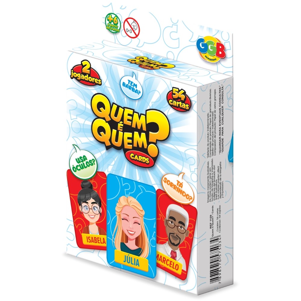 ***PRODUTO GGB EM PORTUGUÊS, ORIGINAL, OFICIAL, LACRADO E COM NOTA FISCAL*** JOGO QUEM É QUEM 54 CARTAS GGB BRINQUEDOS PERSONAGENS MESA PERGUNTAS CARA A CARA FAMÍLIA ADIVINHA Informações Técnicas: - Material: Papel de gramaturas diversas. - Contém: 54 cartas. - EAN: 7898570575034 - Código: 1129 - Produto certificado: INMETRO REGISTRO 004 211/2018 - Dimensões: 3 cm x 10 cm x 12 cm - Peso: 90g - JOGO - 6+ ANOS - GGB - 2 Jogadores - Garantia: Contra defeitos de fabricação - Prazo de Validade: Indeterminado Obs: O tamanho de cada peça pode sofrer variações. Imagens meramente ilustrativas. O produto e as cores podem variar de acordo com o apresentado na embalagem. ATENÇÃO! NÃO RECOMENDÁVEL PARA CRIANÇAS MENORES DE 3 (TRÊS) ANOS POR PODER GERAR PARTE(S) PEQUENA(S) QUE PODE(M) SER ENGOLIDA(S) OU ASPIRADA(S). Adivinhe quem é o jogador adversário Faça perguntas e descarte as opções Vence quem adivinhar primeiro! --------------------------------------------------- SEJA MUITO BEM VINDO(A) A LOJA DE BRINQUEDOS DO CANAL 40 POR QUÊ COMPRAR NA LOJA DE BRINQUEDOS DO CANAL 40? *Enviamos seu pedido sempre no mesmo dia ou no máximo no próximo dia útil dependendo do horário da sua compra! *Produtos lacrados, originais e oficiais da mais alta qualidade; *Experiência única de compra (incluindo a experiência olfativa - você sentirá nosso cheiro); *Todos os nossos produtos estão à pronta entrega em nosso estoque físico aqui no Brasil; *Seu pedido será enviado com segurança e agilidade; IMPORTANTE: Tenha tranquilidade de comprar com quem está disposto a te oferecer o melhor atendimento, caso tenha algum problema após a compra, conte com nossa equipe de pós venda para solucioná-lo! A LOJA DE BRINQUEDOS DO CANAL 40 tem a missão de garantir a satisfação total do seu cliente, tanto nos produtos quanto no atendimento. Assim estabelecemos uma relação única de confiança! Não encontrou o que procurava? Clique na foto da nossa logo para entrar em nossa loja e ver todos os nossos produtos OU nos mande uma mensagem diretamente aqui pelo chat. SERÁ UM PRAZER ATENDÊ-LO(A)! --------------------------------------------------- MUITO PRAZER, ME CHAMO FELIPE CAMARGO, SOU DONO, CEO E CRIADOR DE CONTEÚDO DO CANAL 40. DESDE JÁ, DEIXO AQUI O MEU MUITO OBRIGADO!!! CANAL 40 - LOJA DE BRINQUEDOS LTDA DEIXE SUA CRIANÇA INTERIOR FELIZ E APROVEITE!