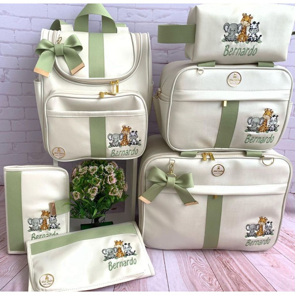 kit de 6 peças 1 Mala G 1 bolsa M 1 mochila 2em1 1 nessecer 1 trocador 1 Porta Cartão de Vacina Medidas Mala G Altura: 30 cm Complemento:42 cm Largura:20 cm Bolsa M Altura:22 cm Complemento:31 cm Largura:18 cm Mochila 2em1 34 cm de altura. 30 cm de largura. 16 cm de comprimento com bolsos internos e externos toda impermeável e térmica com alças de poliéster após a compra informe o nome do bebê pelo chat