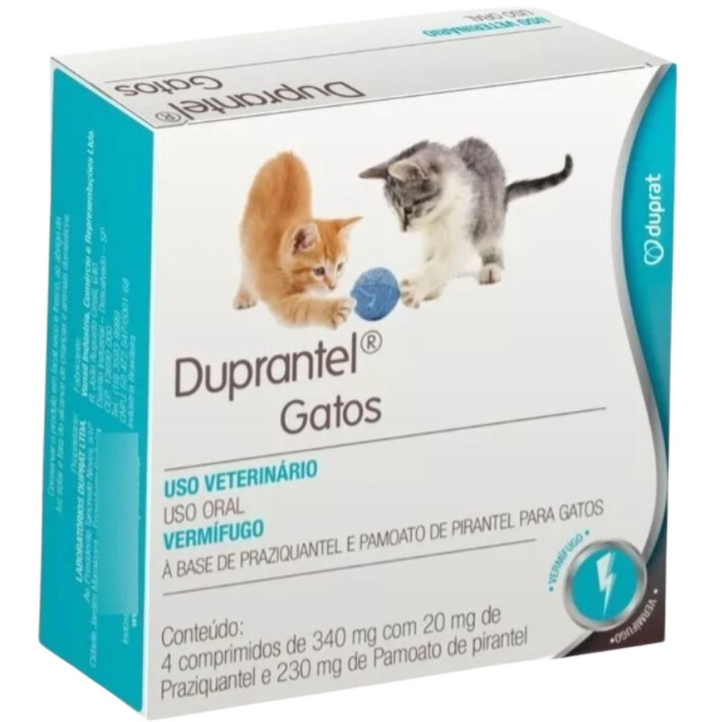 A MANADA ANIMAL é um marketplace de produtos veterinários. É a escolha certa para tutores que prezam pela qualidade dos produtos que seu animal necessita. Tudo com o suporte de uma equipe de veterinários e gestores com mais de 10 anos de experiência no mercado. Fique tranquilo, todos os nossos produtos são originais, adquiridos através de distribuidores credenciados! Ah, e todas as vendas acompanham nota fiscal! MANADA ANIMAL, Tranquilidade pra você, cuidado para ele! _____________________________________________ Descrição - Praziquantel, Pamoato de Pirantel; - Indicado para gatos; - Vermífugo de largo espectro; - Elimina Cestódeos e Nematódeos; - Consulte o médico veterinário de sua confiança. * Consulte sempre o Médico Veterinário de sua confiança para o uso apropriado deste produto. Leia a bula ou informações descritas na embalagem. Detalhes O Vermífugo Duprat Duprantel Gatos é de amplo espectro, indicado para combate e eliminação de endoparasitas, tais como Cestódeos (vermes chatos): Dipylidium caninum, Ancylostoma caninum, Echinococcus granulosus, Echinococcus multilocularis, Taenia spp.; e Nematódeos (vermes redondos): Ancylostoma braziliense, Ancylostoma tubaeforme, Toxocara cati, Toxascaris leonina. Dicas Especiais Em conjunto com a vermifugação, é importante fazer uma limpeza profunda no ambiente com produtos à base de cloro ativo, de alta eficácia no combate às larvas e ovos de parasitas.