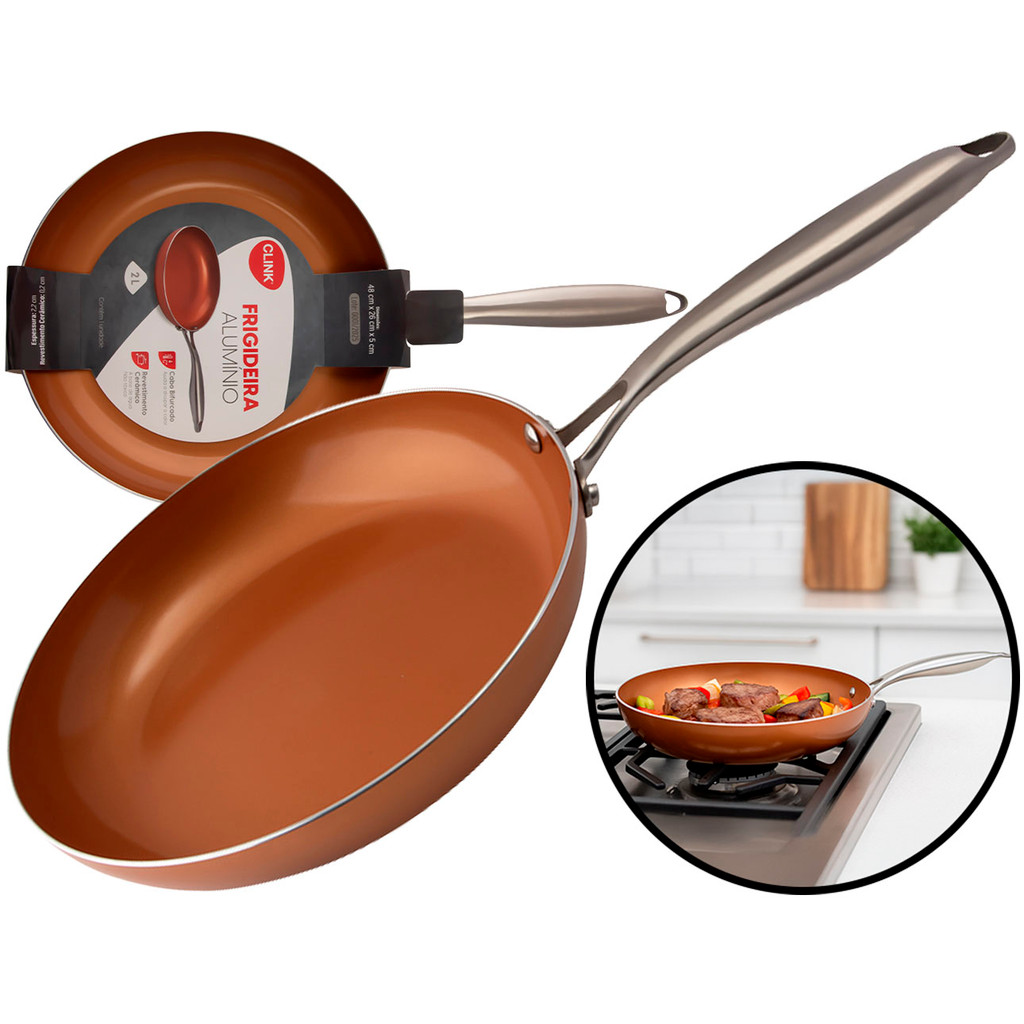 Frigideira Cobre 2 Litros Clink A Frigideira da Clink é a escolha ideal para quem procura praticidade e design moderno na cozinha. Possui capacidade de 2 litros, e é perfeita para preparar diversos tipos de pratos. É fabricada em alumínio e aço inox, proporcionando excelente distribuição de calor, garantindo que os alimentos cozinhem de forma uniforme e rápida. Características: > Revestimento cerâmico; > Capacidade de 2 litros; > Design moderno com acabamento cobre; > Combina com diferentes estilos de cozinhas, trazendo elegância e sofisticação ao ambiente. Especificações Técnicas: > Materiais: alumínio e aço inox; > Dimensões do produto (C x L x A): 48cm x 26cm x 5cm. - Marca: Clink - Garantia: 90 dias contra defeitos de fabricação Vantagens de comprar na Brester: - Produto a pronta entrega. - Produto novo, com garantia de fábrica. - Nota fiscal para Pessoa Física e Pessoa Jurídica.