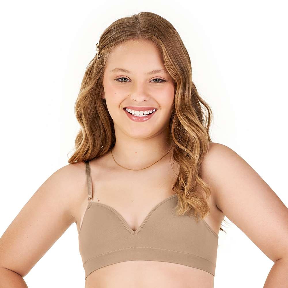 O Sutiã Teen Com Bojo Sem Costura. Meninas querem conforto e esta peça conta com bojo macio e alças reguláveis para se adequar melhor ao corpo. A cor bege é coringa no guarda-roupa das meninas e é ideal para compor com looks mais claros. Destaque: *Este produto é confeccionado com a tecnologia seamless (sem costura). Diferente da confecção tradicional, esta tecnologia produz as peças inteiras em teares. A peça sai praticamente pronta, por isso, descarta a costura para montar diferentes partes das peças, utilizando estas interferências apenas em pequenos acabamentos, proporcionando máximo conforto, maior durabilidade e menos descartes têxteis na produção. Esta tecnologia evita que a peça marque o corpo durante o uso. Composição: CORPO: 89%POLIAMIDA | 11%ELASTANO BOJO: 100%POLIÉSTER REF: ZR2403001 C122
