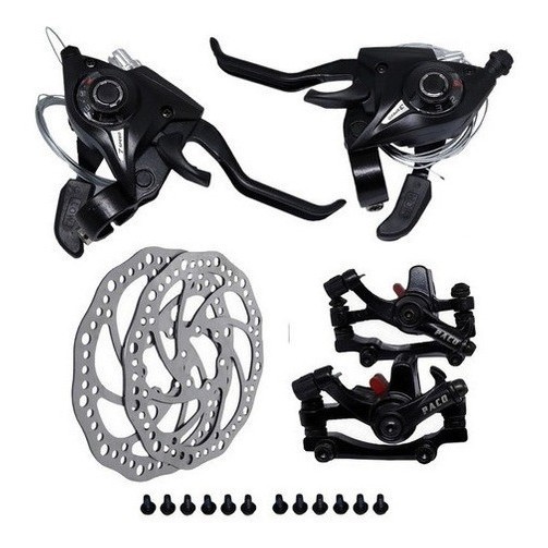 Frenagem precisa e eficaz, componente de segurança essencial para ciclistas exigentes. As pinças de Freio a Disco de Bicicleta paco são forjadas em alumínio, contém suas pastilhas semi-metálicas, e os seus discos contém 160mm. Acompanha 12 parafusos. Componente de entrada, as alavancas paco atendem solicitações diárias das bicicletas. Compatíveis com sistema freio disco e borracha. Maçanetas leves, acabamento em alumínio e sistema de 21v. Não podem ser utilizadas em conjunto com câmbios Shimano. CARACTERÍSTICAS Composição Alumínio Pastilhas Removíveis e Pastilhas Semi-metálicas; Corpo e puxadores em Alumínio; 21 velocidades funcionais; Troca de Marchas no único toque DÚVIDAS FREQUENTES 1 - Minha bicicleta não contém uma ou as duas furações para fixar as pinças, o que eu faço? Caso a sua bicicleta não contenha as furações para fixar as pinças, abaixo há o campo de perguntas onde você pode nos fornecer o modelo de sua bike, que nós lhe retornaremos com o kit compatível com os adaptadores para o seu modelo. 2- Qual é o tamanho de roda/aro compatível com este kit? Tamanhos 20; 24; 26 e 29. Desde que respeitem as condições das furações. ESPECIFICAÇÕES DOS PRODUTOS ESPECIFICAÇÕES Alavanca Passador de Cambio Rapid Fire 21m com maçaneta de freio em alumínio; Composição: alumínio, aço, pvc; Marca: Absolute Freio a disco de alumínio dianteiro e traseiro 02 Pinças de freio; 02 Disco 160mm; 04 parafusos Allen de fixação da pinça; 12 parafusos Allen p/ fixar disco; Composição: pinça de alumínio e disco 160mm de aço; Marca: Absolute