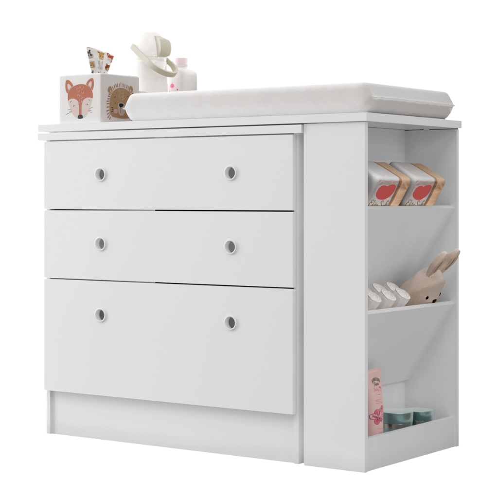 🍼 CÔMODA TROCADOR GIRATÓRIA 3 EM 1 COM NICHOS + COLCHÃO IMPERMEÁVEL INCLUSO ✅ Colchão impermeável incluso ✅ Gira 360º – acesso mais fácil e rápido ✅ Nichos organizadores laterais ✅ 2 gavetas + 1 gavetão com corrediça metálica ✅ Design moderno em MDF branco ✅ Montagem fácil com manual incluso A solução ideal para o quarto do seu bebê! A Cômoda Giratória 3 em 1 une praticidade, beleza e organização em um único móvel multifuncional. Perfeita para pais que buscam otimizar o espaço e tornar o momento da troca mais prático e seguro. ✨ DESTAQUES DO PRODUTO: 🔄 Bancada giratória inteligente A parte superior gira com suavidade, facilitando o acesso ao trocador e aos nichos laterais. 🧺 Espaço que faz a diferença 2 gavetas e 1 gavetão com amplo espaço para fraldas, roupinhas e acessórios. Nichos laterais ideais para deixar à mão pomadas, toalhinhas e brinquedos. 🧼 Fácil de limpar e segura para o bebê Pintura UV atóxica Colchão com capa impermeável Estrutura em MDP de alta resistência Puxadores em PVC 🛠️ Montagem descomplicada Manual incluso para você montar sem dor de cabeça! 📐 DIMENSÕES: Altura: 76 cm Largura: 91 cm Profundidade: 42 cm 📦 ITENS INCLUSOS: 1 Cômoda Trocador 1 Colchão Impermeável 1 Manual de Montagem
