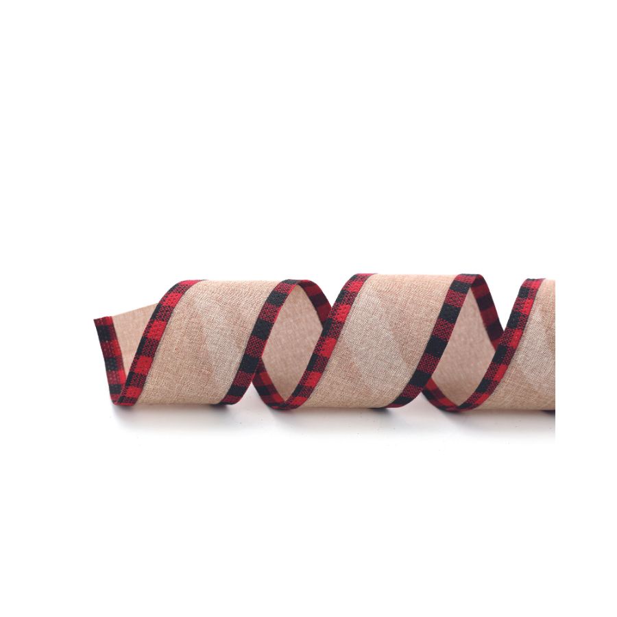 Fita Decorativa de Natal, cor cru, com borda xadrez vermelho e preto