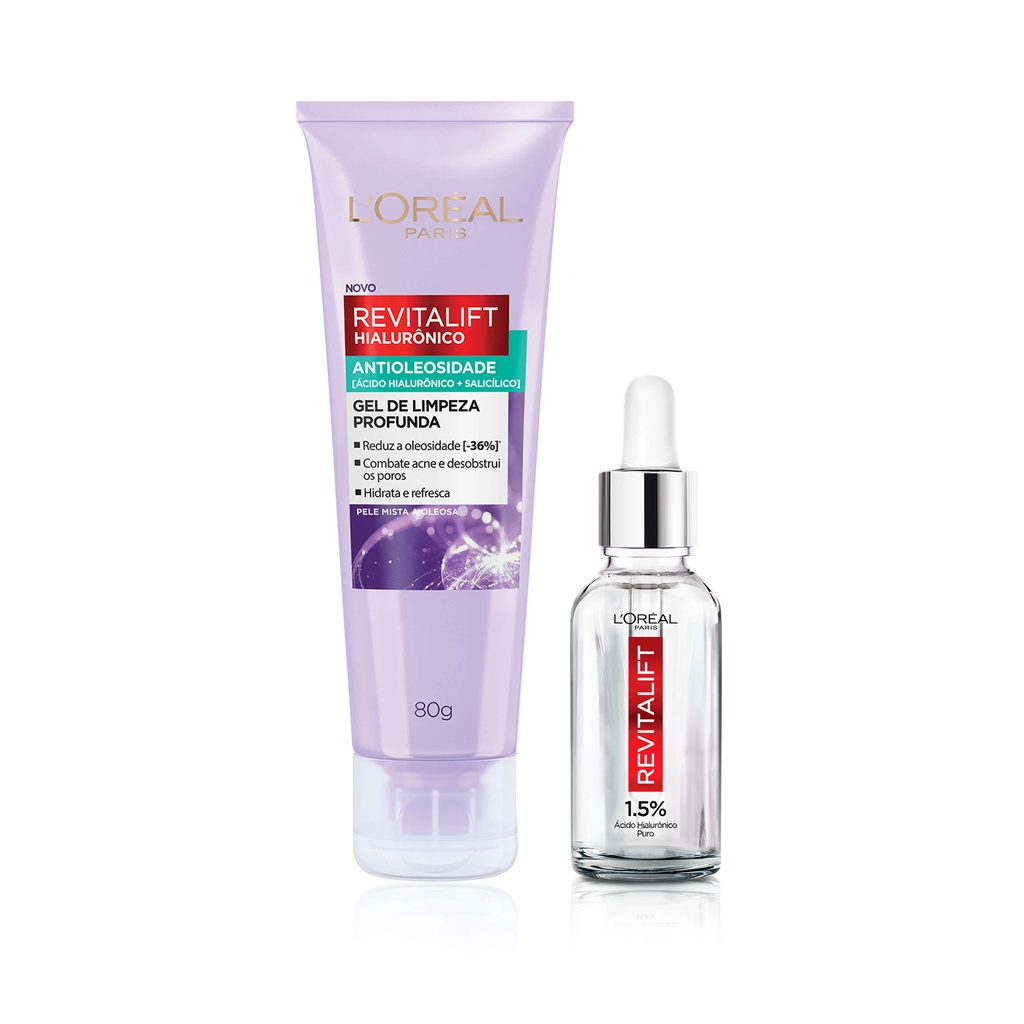 Kit Revitalift Hialurônico de L´Oréal Paris, tratamento anti-idade e antioleosidade, com o poder preenchedor do ácido hialurônico e o poder antioleosidade do ácido salicílico, para a sua rotina de skin care. Esse kit contém: 1 Gel de Limpeza Antioleosidade L'Oréal Paris Hialurônico, 80g 1 Sérum Preenchedor Facial Anti-idade L'Oréal Paris Revitalift Hialurônico, 15ml Conheça os produtos: 1. Gel de Limpeza Antioleosidade L'Oréal Paris Hialurônico, 80g - é um produto com fórmula ultra-leve desenvolvida pelos laboratórios de L’ORÉAL PARIS para peles mistas a oleosas, com dupla ação anti-idade + antioleosidade: preenche as linhas finas com hidratação e reduz visivelmente os poros, com 8H de controle de oleosidade. Uma combinação perfeita de ingredientes altamente utilizados por dermatologistas em uma fórmula de alta eficácia. 2. Sérum Preenchedor Facial Anti-idade L'Oréal Paris Revitalift Hialurônico, 15ml - é um sérum anti-idade com ação preenchedora. Sua fórmula possui uma rápida absorção, sem sensação oleosa e não obstrui os poros. Com 1,5% de ácido Hialurônico, hidrata a pele e reduz até 40% das linhas de expressão em até 4 semanas. Testado com dermatologistas é indicado para todo tipo de pele e é adequado também para peles sensíveis. Tecnologia: Ácido Hialurônico: a gama completa Revitalift Hialurônico L'Oréal Paris é enriquecida com Ácido Hialurônico puro, substância produzida naturalmente pelo organismo e presente na pele, mas a sua produção decai com o passar dos anos. Possui um alto poder preenchedor, capaz de manter até 1000x o seu peso em água hidratando e preenchendo a pele, devolvendo a vitalidade e combatendo linhas de expressão. Não agride a pele, leve como água. Ácido Salicílico: Ativo indicado por dermatologistas para reduzir o excesso de oleosidade na pele. Ainda auxilia a desobstruir poros e combate acnes e cravos.