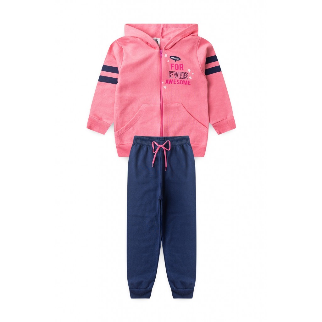 Conjunto em moletom 100% algodão super quentinho e delicado. Jaqueta na cor rosa com estampa frontal, estampa nas mangas, zíper, bolso canguru e capuz. Calça na cor azul marinho lisa com cadarço decorativo.