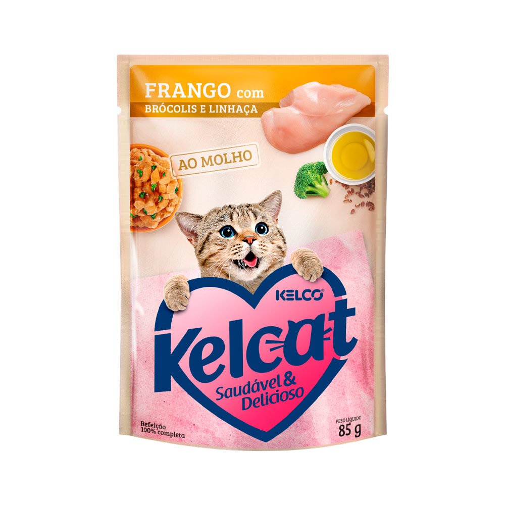 Ração Úmida Kelcat Sachê Para Gatos Sabor Frango, Brócolis e Linhaça 85g - Indicado para gatos; - Suculentos ingredientes cozidos a vapor;- Alimento 100% completo e balanceado;- Sabor frango, brócolis e linhaça. A Ração Úmida Kelcat Frango Com Brócolis e Linhaça é saudável e deliciosa. Alimento completo e saboroso é feito com pedaços de frango com brócolis e linhaça cozidos a vapor.Alimento úmido prático e vem pronto para abrir e servir. Uma refeição balanceada que proporciona vitalidade, atende às principais necessidades nutricionais do seu felino e auxilia na hidratação diária. Ingredientes Carne mecanicamente separada de frango, fígado de aves, brócolis (min.1.0%), óleo de linhaça (min.0,1%) plasma sanguíneo desidratado de suíno, farinha de trigo, fibra de mandioca, celulose em pó, carbonato de cálcio, água, goma xantana, cloreto de sódio(sal comum) , tripolifosfato de sódio, hidrolisado de fígado de aves, taurina, vitaminas (A, D3, E, B1, B2, B6, B12, K3, niacina, pantotenato de cálcio, ácido fólico e biotina), minerais ( sulfato de ferro, sulfato de cobre, monóxido de manganês, sulfato de zinco, iodato de cálcio e selenito de sódio), aroma de frango (min.0,01%) e corante caramelo.