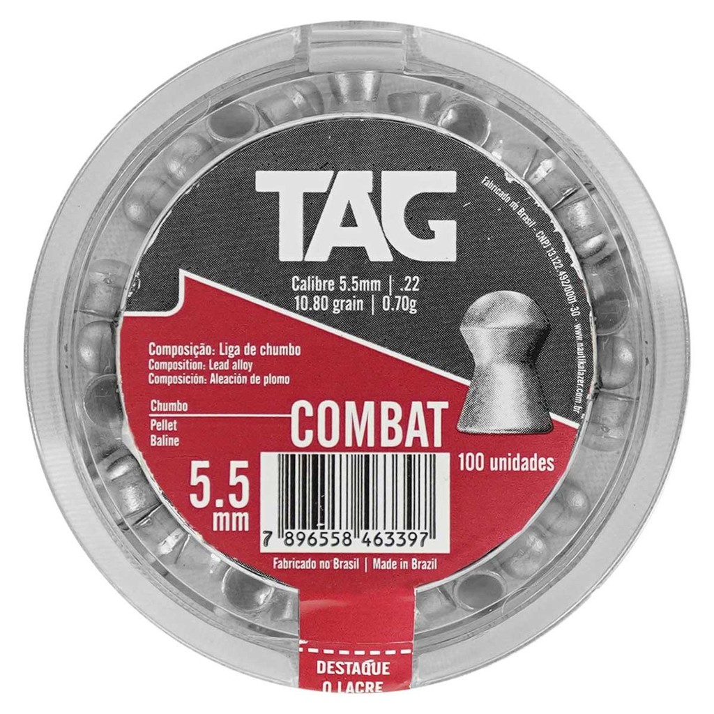 Produto de uso exclusivo em práticas esportivas. Esse é o Chumbinho da marca TAG modelo COMBAT cuja aerodinâmica entrega excelente poder de impacto e penetração. Compatível especificamente com Armas de pressão que tenham calibre 5.5mm (.22). Seu design de cabeça redonda com saia lisa o torna a opção perfeita para atiradores que buscam uma munição versátil e com ótimo custo benefício. ESPECIFICAÇÕES TÉCNICAS: - Marca: Tag - Calibre: 5.5mm (.22) - Modelo: Combat - Material: Chumbo - Quantidade: 100 Unidades - Peso: 0.70 gramas - Gramatura: 10.80 grains - Comprimento unitário: 5,9mm - Peso total de cada embalagem: 87 gramas ITENS INCLUSOS: - 01 Chumbinho Tag Combat 5.5mm 100un. Observação: Garantia de 03 meses mediante defeitos de fábrica. INFORMAÇÃO: Os equipamentos, peças e acessórios aqui listados são de uso exclusivo em armas de pressão (gás comprimido ou mola), airsoft, paintball, esferas plásticas (BBS) e estão em conformidade com a legislação brasileira de USO PERMITIDO "É permitido o uso de armas de pressão por ação de gás comprimido ou por ação de mola, com calibre igual ou inferior a seis milímetros (6mm ou 6.0mm), e das que lançam esferas de plástico com tinta, como os lançadores de paintball." Conforme parágrafo único do Art. 11 do DECRETO Nº 11.615, DE 21 DE JULHO DE 2023. A venda desses itens é feita somente para maiores de 18 anos mediante a comprovação de maior idade. Atenção: O envio de Armas de pressão e Airsoft é realizado somente por transportadora. Caso tenham dúvidas entrar em contato.