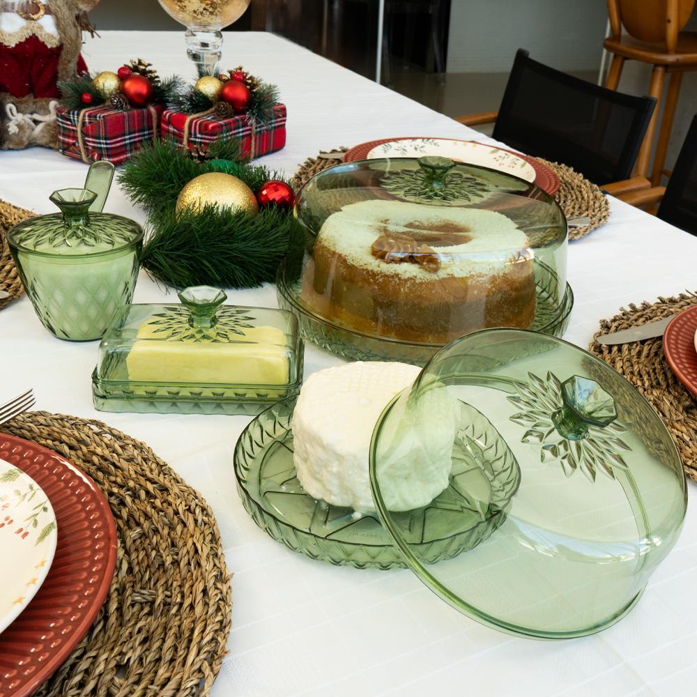 - O Natal está chegando e para celebrarmos juntos criamos kits exclusivos para mostrar que as comemorações de fim de ano já podem começar! - Os produtos possuem versatilidade para compor mesas, decorações e podem ser usados em diversas composições, como temas natalinos. - O kit mesa posta é composto por 4 peças: 1 boleira baixa: produto diferenciado que se destaca na mesa posta. Com acabamento sofisticado traz charme, beleza e praticidade aos encontros, sejam eles mais formais ou informais. 1 manteigueira: com tampa é um produto prático e funcional. Além de compor lindas mesas também é usado para deixar o alimento em seu devido lugar na geladeira, ajudando na organização diária. 1 açucareiro: com tampa e colher é uma ótima alternativa para os solúveis refinados, cristal, mascavo, demerara ou orgânico. Além de decorativo é um item funcional que ajuda na composição de lindas mesas e também para uso diário em espaços e bandejas de café e chá. 1 queijeira: com tampa é um produto prático e funcional. Sua base possui um recuo lateral para que o soro possa escoar mantendo seu queijo fresco e saboroso. - Fabricado em poliestireno (PS). Um tipo de plástico rígido semelhante ao acrílico. - Aparência cristalizada com superfícies facetadas: tendência no segmento de moda para casa. - Atóxico e livre de bisfenol-A (BPA FREE). - Não pode ser levado ao freezer, micro-ondas e lava-louças. Não lavar com água quente. - Lavar com o lado macio da esponja e sabão neutro. - Medidas: Boleira - (Diâmetro x Alt): 26,0x14,0 cm Queijeira - (Diâmetro x Alt): 18,0x11,0 cm Manteigueira - (Comp x Larg x Alt): 14,5x8,3x7,4 cm Açucareiro - (Comp x Larg x Alt): 11,5x9,8x11,1 cm *Obs: kit composto apenas pelos produtos da linha Glamour verde. Todos os alimentos, pratos, talheres, jogos americanos e decorações de Natal são para sugestão de uso e produção fotográfica.