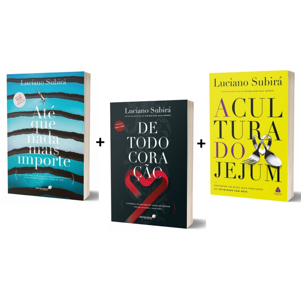 Kit 3 Livros "Até que nada mais importe + De todo coração + A Cultura do Jejum" Até que nada mais importe: Em Até que nada mais importe, o respeitado pastor, autor e palestrante, Luciano Subirá nos apresenta mais que um simples livro de inspiração cristã. Nestas páginas, seremos confrontados pela verdade de que não estamos aqui para viver uma vida efêmera e alucinada, correndo atrás de performances. Estamos indo além dos nossos próprios limites em uma espiritualidade rasa, de longos e “inexplicáveis” jejuns, lendo a Bíblia repetidas vezes sem entendimento, realizando intermináveis campanhas apenas pelo número, apenas por uma simples meta proposta. Deus não quer ser agradado pelo que fazemos, pelos nossos recordes de jejuns ou leitura bíblica. Ele espera que o busquemos com todo o nosso entendimento, que o amemos de todo o nosso coração, de toda nossa alma até que o nosso relacionamento com ele seja a mais absoluta prioridade: Até que nada mais importe! Número de páginas: 160 De todo coração: De Todo Coração, do autor Luciano Subirá, propõe que é possível uma intimidade profunda e sem limites com Deus, desde que seja uma escolha , A sua decisão! Aqui, pelas páginas que deram origem ao best-seller Até que nada mais importe, você será convidado a se entregar de forma completa, sem intermediários, ao amor do abraço de Cristo, permitindo que o espiritual influencie todas as áreas de sua vida. Nesta nova e indispensável edição, com ainda mais conteúdo e reflexões, Luciano ganha companhia do filho, o cantor e compositor Israel Subirá. Como um diálogo de fé, seremos confrontados e levados a nos aprofundar, com todo nosso coração, em como sermos “escravos por amor”, compreendendo o “amor total” como cerne da vida espiritual, sem que percamos de vista a família, os amigos e a igreja. Número de páginas: 224 A cultura do jejum: O autor debruçou-se sobre as Escrituras e recorreu a especialistas na área médica para produzir um texto rico em conteúdo e bastante prático para o exercício dessa disciplina espiritual amplamente citada nas Escrituras. Ao concluir a leitura deste livro, tem-se a impressão de que o autor esgotou o assunto ao analisar de forma rica e profunda essa temática bíblica. Além de examinar o essencial, o que é o jejum e o que a Bíblia diz a respeito, ele vai além e enriquece a análise ao apresentar os tipos de jejum, sua duração, seus efeitos, seus propósitos e a forma de jejuar, sem contar os aspectos médico-científicos relacionados a essa prática milenar. Há um capítulo especial em que Subirá responde de forma clara e sucinta a 40 questões específicas sobre o assunto. Este livro é uma visão bíblica e profética do jejum para o tempo do fim e o conduzirá a um nível mais profundo de intimidade com Deus. Número de páginas: 272 Detalhes: Detalhes do Produto: Autor: Luciano Subira Editora: Hagnos Acabamento: Brochura Dimensões: 16 larg. X 23 alt.