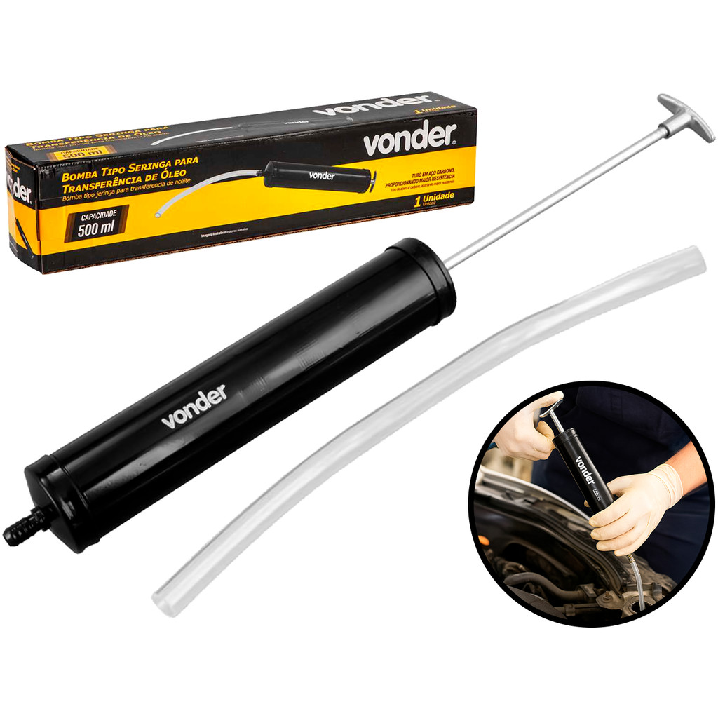 Bomba Para Transferência De Óleo 500ml Vonder A Bomba Tipo Seringa Vonder é ideal para a transferência de óleos lubrificantes e outros líquidos automotivos com facilidade e precisão. Com capacidade de 500ml, é perfeita para aplicações em locais de difícil acesso, garantindo maior controle durante o uso, evitando desperdícios. É prática, eficiente e indispensável para trabalhos em oficinas. Características: > Indicado para realizar transferências de óleo; > Capacidade de 500ml para operação simples e rápida; > Tubo em aço carbono, proporcionando maior resistência; > Bico tipo seringa, que permite um controle preciso na aplicação do óleo e facilidade de manuseio. Especificações Técnicas: > Material: aço carbono; > Diâmetro do bico de saída: 10mm; > Capacidade do reservatório: 500ml; > Comprimento total do tubo: 730mm. - Marca: Vonder - Garantia: 90 dias contra defeitos de fabricação Vantagens de comprar na Brester: - Produto a pronta entrega. - Produto novo, com garantia de fábrica. - Nota fiscal para Pessoa Física e Pessoa Jurídica.