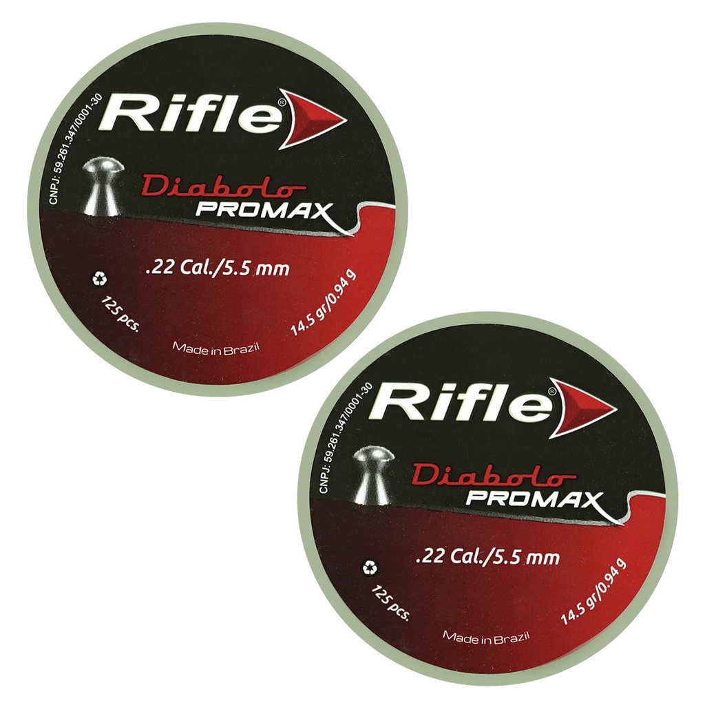 Produto de uso exclusivo em práticas esportivas. O uso do produto exige treinamento e equilíbrio emocional. Deverá ser guardado em lugar seguro e fora do alcance de terceiros. A marca RIFLE é uma empresa que há 30 anos fabrica as melhores munições para Armas de Pressão e Ar comprimido do Brasil. Reconhecida por produzir Chumbos que estão entre os quatro melhores do mundo, usados também por atletas olímpicos e campeões mundiais, aprovados pelas melhores fabricantes de armas do mundo. Símbolo de qualidade e excelência. O Chumbinho modelo PROMAX da linha DIABOLO da Rifle é um lançamento de 2020. Oque mais se destaca nele sem dúvidas é o fator de agrupamento. Apesar de ser considerado um Chumbinho de entrada ele conquistou o respeito dos atiradores. Escolher uma munição de qualidade é essencial para seu desempenho na prática do Tiro Esportivo. Atendendo o alto padrão de qualidade esse Chumbinho da Rifle não possui rebarbas, opção perfeita para sua Arma de Pressão. ESPECIFICAÇÕES TÉCNICAS: - Marca: Rifle - Calibre: 5.5mm (.22) - Modelo: Promax - Linha: Diabolo - Material: Chumbo - Quantidade: 125 unidades cada - Peso: 0.94 gramas - Gramatura: 14.5 grains - Comprimento: 6,6mm ITENS INCLUSOS: - 02 Latas de Chumbinho Rifle Diabolo Promax 14.5gr 5.5mm 125un. (cada) Observações: Garantia de 03 meses mediante defeitos de fábrica. INFORMAÇÃO: Os equipamentos, peças e acessórios aqui listados são de uso exclusivo em armas de pressão (gás comprimido ou mola), airsoft, paintball, esferas plásticas (BBS) e estão em conformidade com a legislação brasileira de USO PERMITIDO "É permitido o uso de armas de pressão por ação de gás comprimido ou por ação de mola, com calibre igual ou inferior a seis milímetros (6mm ou 6.0mm), e das que lançam esferas de plástico com tinta, como os lançadores de paintball." Conforme parágrafo único do Art. 11 do DECRETO Nº 11.615, DE 21 DE JULHO DE 2023. A venda desses itens é feita somente para maiores de 18 anos mediante a comprovação de maior idade. Atenção: O envio de Armas de pressão e Airsoft é realizado somente por transportadora. Caso tenham dúvidas entrar em contato.