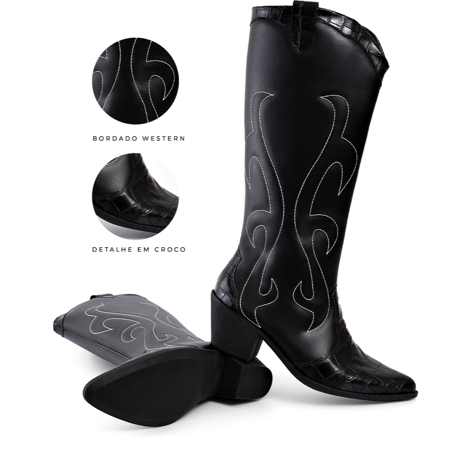 O modelo perfeito para as antenadas e que gostam de moda e estilo é nossa bota western cano longo. Ela tem um bordado lateral que dá um toque extra de charme e detalhes em croco enchendo o modelo de estilo. A bota de salto bloco bico fino além de um clássico é perfeita para trazer elegância para os seus looks. Ela também conta com um cano alto e um salto confortável, então conforto não será uma preocupação. É um modelo que vale a pena você investir, porque você vai usar muito nesse inverno e nos próximos que virão. ESPECIFICAÇÕES DO PRODUTO ..:::.. *Material Externo - Napa Soft Confort *Material Interno - Material Têxtil Super Confortável. *Solado - Emborrachado Anti-Derrapante, não faz barulho, não escorrega. *Altura do salto - 6,0 cm. *Altura do cano - 35cm (com pequena variação de acordo com a numeração) *Circunferencia do cano - 35 cm (com pequena variação de acordo com a numeração) *Palmilha - Confortável com aplique da logo. Medida aproximada dos pés para cada numeração: Tamanho 34 --- 24,9 cm Tamanho 35 --- 25,6 cm Tamanho 36 --- 26,1 cm Tamanho 37 --- 26,9 cm Tamanho 38 --- 27,5 cm Tamanho 39 --- 28,0 cm Tamanho 40 --- 29,0 cm SOBRE A LUMISS: Desde 2018, brilha no coração da Lumiss a inovação para calçados femininos. Nascida como Amorelle, a marca é fruto do sonho de um visionário que sempre acreditou na possibilidade de fabricar calçados que surpreendessem o mercado, tanto pela variedade quanto por seus preços acessíveis. Com muito trabalho em família, essa ideia foi levada adiante, fortalecendo uma marca que hoje é referência nacional em calçados femininos, com presença marcante nos marketplaces e mais de dois milhões de pares já entregues em todo o Brasil. Comprometida com cada cliente, a Lumiss oferece as maiores tendências do mundo da moda a partir de materiais que garantem conforto, qualidade, sofisticação e estilo aos pés da mulher brasileira, encantando até mesmo os perfis mais exigentes. Além disso, a empresa se preocupa em oferecer a melhor experiência de compra, com total segurança e praticidade. Lumiss é mais que uma marca. É uma ideia que chegou para mostrar que todas as mulheres podem brilhar e ser ainda mais lindas e confiantes com calçados que as valorizam em todos os aspectos.
