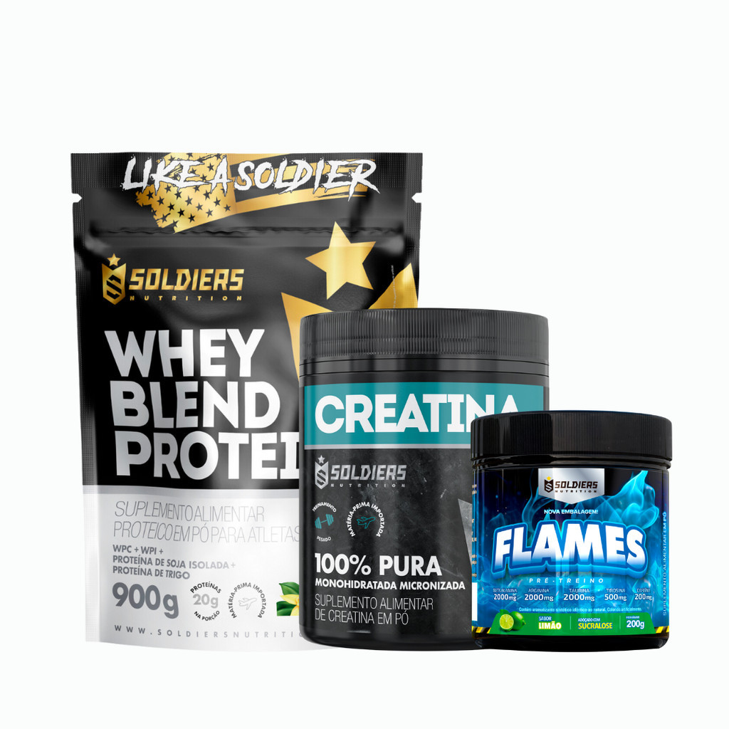 Kit: Whey Blend Protein Concentrado e Isolado 900g +Creatina Monohidratada Pote 300g 100% Pura+Pré-Treino Flames 200g -Soldiers Nutrition_x000D_ _x000D_ _x000D_ O Whey Blend Protein Concentrado e Isolado - 900g - Soldiers Nutrition possui a associação de Proteína Concentrada do Soro do Leite com Proteína Isolada da Soja sendo uma fonte de proteína completa que contém todos os aminoácidos essenciais requeridos pelo organismo. É uma proteína facilmente digerível e rapidamente absorvida, tornando-se um suplemento popular entre atletas e entusiastas do fitness._x000D_ _x000D_ Com o apoio do crescimento e a recuperação muscular, melhorar o desempenho atlético e aumentar a saúde e o bem-estar geral._x000D_ _x000D_ A WPC apresenta uma maior concentração proteína, cálcio entre outras Sendo uma proteína de alto valor biológico._x000D_ _x000D_ Whey Blend Protein Concentrado e Isolado - 900g - Soldiers Nutrition é um novo produto que apresenta em sua formula as melhores matérias-primas de WPC + WPI + proteína isolada de soja + proteína de trigo. Tendo a combina perfeita de proteínas essenciais para a recuperação musculas por exercícios físicos._x000D_ _x000D_ Contém_x000D_ - WPC + WPI + PROTEÍNA DE SOJA ISOLADA E PROTEÍNA DE TRIGO_x000D_ - 20g Proteína por porção_x000D_ - Matéria Prima Importada_x000D_ _x000D_ Modo de preparo: Dissolver 1 medida dosadora em 1 copo de 200ml de água gelada_x000D_ Fontes de proteínas que auxiliam na formação dos músculos e ossos_x000D_ _x000D_ Contém Glúten_x000D_ Contém Lactose_x000D_ Alérgicos: Contém derivados de trigo, leite e soja_x000D_ _x000D_ _x000D_ Creatina Monohidratada Pote 300g - 100% Pura Importada - Soldiers Nutrition_x000D_ Acompanha Colher Dosadora 3g_x000D_ _x000D_ Produto aprovado diversos laudos laboratoriais, inclusive pela ABENUTRI (Associação Brasileira de Empresas de Produtos Nutricionais)_x000D_ _x000D_ _x000D_ BENEFÍCIOS DA CREATINA:_x000D_ _x000D_ - Aumenta a capacidade do músculo de gerar força;_x000D_ - Aumento de massa magra;_x000D_ - Aumento da capacidade de treinamento;_x000D_ - Previne o catabolismo muscular;_x000D_ _x000D_ _x000D_ A creatina é um derivado de aminoácidos obtida através da dieta de síntese por nosso próprio organismo. Ela está presente essencialmente no músculo e auxilia na manutenção dos níveis de energia durante períodos breves de exercício intenso. Ou seja, sua função é crucial nos treinos com muito peso na busca pelo ganho de massa._x000D_ _x000D_ _x000D_ creatina é insulinodependente, isso significa que é preciso consumi-la junto com alimentos/suplementos que influenciem a produção de insulina. A lista de itens que possui este efeito envolve carboidratos de alto índice glicêmico como dextrose, maltodextrina, arroz, pão, macarrão e proteínas de alto índice insulinêmico como leite e whey protein._x000D_ _x000D_ A sugestão de consumo determinada pela ANVISA é de 3gr ao dia._x000D_ _x000D_ Modo de Preparo: Diluir 3g (1 colher dosadora) da creatina em 200ml de água ou bebida de sua preferência._x000D_ _x000D_ Consumir uma porção ao dia ou conforme recomendação do nutricionista ou médico._x000D_ _x000D_ _x000D_ Pré-Treino Flames 200g - 100% Importado - Soldiers Nutrition_x000D_ _x000D_ BENEFÍCIOS DO FLAMES:_x000D_ - Aumento de energia e disposição;_x000D_ - Foco nos treinos;_x000D_ - Tira a fadiga;_x000D_ - Aumento de força e concentração nos treinos;_x000D_ - Aumento de resistência física;_x000D_ _x000D_ _x000D_ O pré treino é feito para quem pratica exercícios com muita intensidade e necessita de mais energia para manter o auto nivel de treinamento. Ele auxilia na melhora do desempenho durante a prática dos exercícios físicos, reduzindo o cansaço, a falta de foco e a indisposição._x000D_ _x000D_ Composto por diversos ingredientes essenciais para manter a energia corporal alta como por exemplo a cafeína e taurina. Além de outros nutrientes que são necessários para a realização de exercícios de alto desempenho e intensos. Aumentando a resistência física e diminuindo a fadiga._x000D_ _x000D_ ANVISA:_x000D_ Registro ISENTO conforme resolução RDC 27 de 06 de agosto de 2010 anexo I._x000D_ Registro ISENTO conforme resolução RDC 240/2018._x000D_