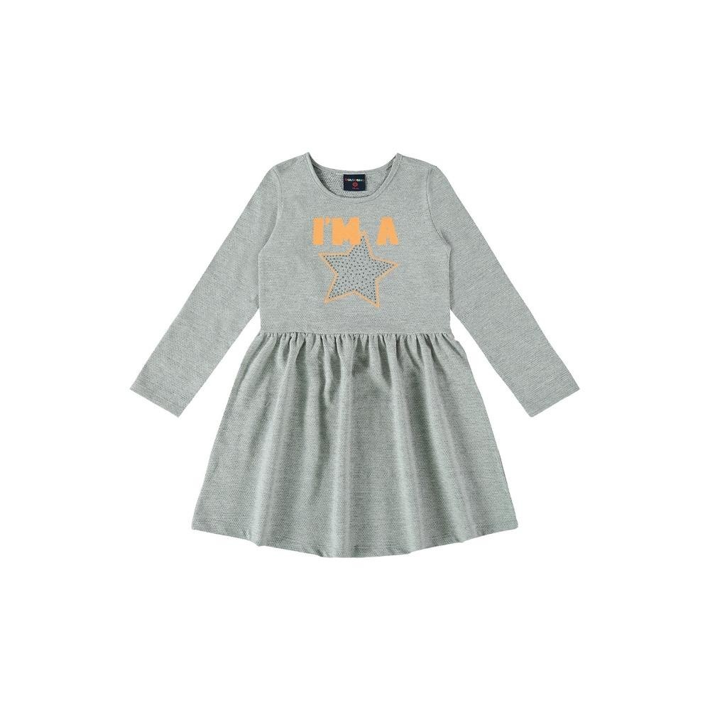 Vestido infantil confeccionado em malha trabalhada, possui gola redonda, mangas longas, estampa com escrita e strass. Perfeito para diversas ocasiões, este vestido é uma escolha versátil e moderna para destacar o visual das meninas.Tecido: Malha TrabalhadaComposição: 90% algodão e 10% poliésterModelagem: JustaComprimento Manga: LongaComprimento: CurtoForro: NãoDecote/Gola: Redondo