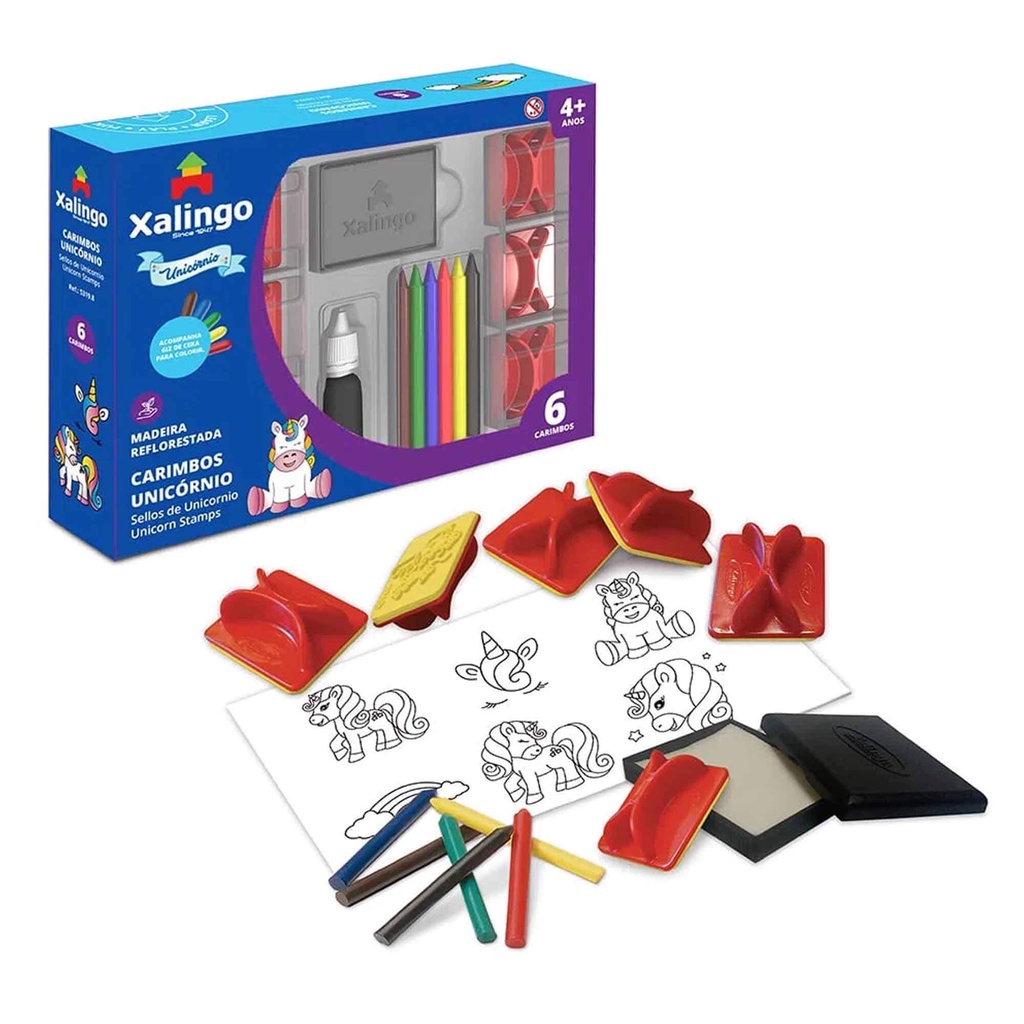 Carimbos Unicórnio com 6 Carimbos e Giz de Cera Desenhar Pintar Personagens Divertidos Criatividade Xalingo - 5319.8 Brincar com carimbos nunca ficou tão divertido! Com os Carimbos Unicórnios da Xalingo Brinquedos, a brincadeira está garantida! Conta com 6 carimbos diferentes, de cabo plástico e borracha atóxica. Acompanha 1 almofada para carimbo, 1 frasco de tinta atóxica, 1 bloco de papel e giz de cera para colorir as imagens carimbadas durante a brincadeira. Desenvolve a coordenação motora e as habilidades de identificar, desenhar, pintar, criar e contar histórias a partir de cenários com os unicórnios em um mundo mágico! É pura diversão! Indicado para crianças a partir de 4 anos. MODO DE BRINCAR: - Apresentar o conjunto de peças e deixar que a criança explore livremente, carimbando, identificando e descobrindo as possibilidades do material. - Brincar com os carimbos, colorindo os personagens, criando e contando histórias. - Criar uma sequência de desenhos para identificação e contagem. - Aplique um pouco de tinta por toda a superfície da almofada, com movimentos circulares. Caso necessário, aplique mais até obter o desenho completo. Cuidado para não aplicar tinta em excesso. -O tubo de tinta deve ficar longe do alcance de crianças. Em caso de contato com tecidos pode causar manchas permanentes. - Validade da tinta: 6 meses após aberta. Características: - Marca: Xalingo - Modelo: 5319.8 *Imagens Meramente Ilustrativas Especificações Técnicas: - Inmetro: CE-BRI/IQB 5923 - Idade Recomendada: A partir de 4 anos Conteúdo da Embalagem: - 6x carimbos - giz de cera - Almofada - Tinta atóxica - Bloco de papel