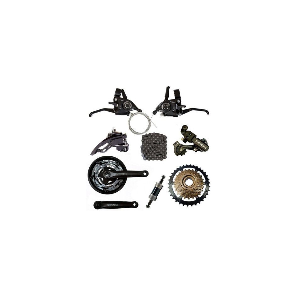 Conteúdo: 1 Jogo de Alavanca 3x7 Manete Aluminio 1 Cambio Dianteiro Dual - PACO 1 Cambio Traseiro TZ31 - Shimano 1 Roda livre index 7m 14/34 dentes 1 Corrente para bicicleta em aço 07 velocidades 1 Pedivela triplo GTA 1 Movimento Central Descrição - Cubo com Rosca - Câmbio Traseiro Fixo no Eixo Traseiro do Cubo do Quadro Especificações do Kit e seus componentes: Cambio Traseiro sem Gancheira Preto Fixação: Direto na Gancheira do Quadro; Composição: Aço; Marca: Shimano; Linha: Tourney. Cambio dianteiro Puxador de cabo por Cima ou por Baixo Compatibilidade: todos os tipos Composição: Aço; Marca: ,yamada, roc, paco ( todos da mesma linha de qualidade, depende do que tem em estoque): Alavanca Passador de Cambio Rapid Fire 21m com maçaneta de freio em alumínio; Modelo: 21 Velocidades v-fire; ComposiÇão: alumínio, aço, pvc; Marca: Gta, Yamada, gts (todos da mesma linha de qualidade, depende do que tem em estoque): Corrente para bicicleta em aço 07 velocidades Cor: prata escuro/azul Marca: importada Roda livre index 7m 13/28 dentes; Cubo com sistema de rosca; ComposiÇão: aço; Cor: dourada Marca: paco, shiftec, shufeng ( todos da mesma linha de qualidade, depende do que tem em estoque) Pedivela triplo Especificação: 24/34/42 Dentes e Eixo Quadrado; Marca: Gta, Ltx Sistema Indexado; Movimento Central 34.7mm 122mm Ponta Quadrada Rolamento - Marca: Neco/Shiftech/SkyNano - Modelo: Selado com Rolamento - Medida: 34.7 mm - Cor: Preto/Cromado - Eixo: Ponta Quadrada - Tamanho: 122 mm - Peso: 339 g - Acompanha Parafusos!