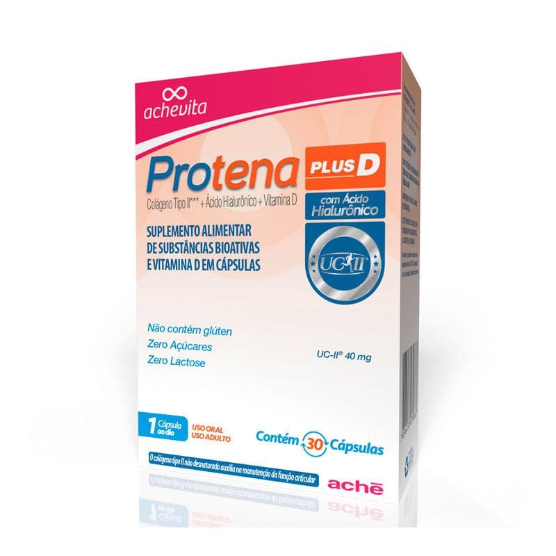 O Suplemento Alimentar Protena Plus D é um suplemento de substância bioativa e vitamina. Formulado com Ácido Hialurônico, Vitamina D e Colágeno Tipo II não desnaturado que auxilia na manuteção da função articular. Não contém glúten, açúcar e lactose.