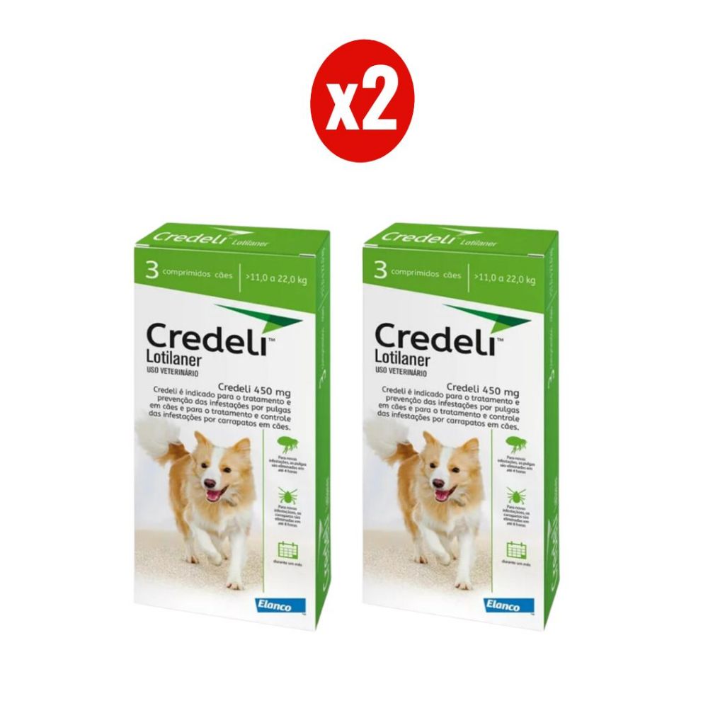 PRODUTO ORIGINAL COM NOTA FISCAL! 2 x CREDELI TAB 450MG 3CP - - - - - Descrição: O Antipulgas Credeli 450mg age contra carrapatos e pulgas, livrando seu amigo de incômodos, dermatite e possíveis problemas causados por esses parasitas. Além de ser uma novidade no mercado, a ação do Antipulgas Credeli 450mg é muito rápida, o que torna um grande benefício o consumo deste produto. É um comprimido mastigável no sabor carne muito saboroso, de fácil aceitação. Ele age também contra dermatite e possíveis inflamações causadas por pulgas e carrapatos. Disponível em embalagens com 1 ou 3 comprimidos, devendo ser consumido um a cada 30 dias. O Antipulgas Credeli 450mg é indicado para cães de todas as idades a partir de 8 semanas de vida, com peso entre 11k e 22kg. O Credeli 450mg é o antipulgas mais rápido existente, ou seja, uma inovação no mercado de remédios, e age de forma diferente para carrapatos e pulgas. Para os carrapatos, ele começa a agir após 4 horas e o efeito total ocorre em até 8 horas, inibe também a infestação de carrapato-estrela causador da febre maculosa. Para as pulgas, seu efeito é mais rápido, tendo resultado parcial em até 2 horas e completo em até 6 horas. Caso haja uma nova infestação, a eliminação completa das pulgas é de até 4 horas. - - - - - Modo de Uso: Por ser um comprimido mastigável , deve ser administrado junto com o alimento ou logo após a refeição. - - - - - Enviamos o seu pedido o quanto antes possível! Obrigado pela preferência.