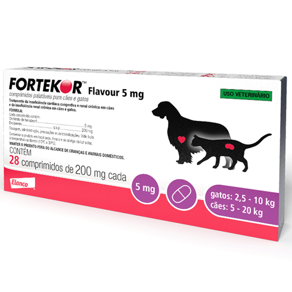 FORTEKOR 5 MG Fortekor Flavour é indicado para tratamento da Insuficiência Cardíaca Congestiva em cães e Doença Renal Crônica em gatos. Modo de usar Insuficiência Cardíaca Congestiva em cães A dose recomendada é de 0,25 mg a 0,50 mg de cloridrato de benazepril para cada quilo de peso corporal, por via oral, uma vez ao dia. Pode ser administrado com ou sem alimento. A dose pode ser dobrada a critério do médico veterinário, mantendo a frequência uma vez ao dia. Doença Renal Crônica em gatos A dose recomendada é de 0,5 mg de cloridrato de benazepril, para cada quilo de peso corporal, por via oral, uma vez ao dia. Pode ser administrado com ou sem alimento. Princípio ativo Cloridrato de benazepril. Administração Via oral. Cães – dose de 0,25 a 0,5 mg/kg – administrado uma vez ao dia. Pode ser dobrada a critério do médico veterinário, mantendo a frequência uma vez ao dia, Gatos – dose de 0,5 mg/kg – administrado uma vez ao dia. As metades remanescentes devem ser colocadas no blister aberto e guardadas (durante 1 dia no máximo) na caixa original do produto. Apresentações Cartucho contendo 2 blisters de alumínio com 14 (quatorze) comprimidos cada, totalizando 28 comprimidos. Contra-indicações vide bula antes da administração. *Consulte um veterinário, ou o Técnico Elanco da sua região para maiores informações sobre o uso desse produto.