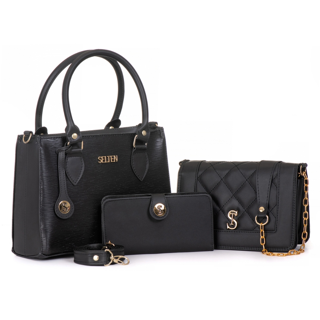 O kit é composto por uma bolsa média, uma bolsa pequena e uma carteira. A bolsa média tem um design clássico e sofisticado, essa bolsa traz o equilíbrio ideal entre modernidade e atemporalidade. O acabamento texturizado confere um toque refinado, enquanto os metais dourados dão aquele charme extra que faz toda a diferença. Compacta por fora, mas surpreendentemente espaçosa por dentro, ela acompanha você com estilo em qualquer ocasião. Seja para um dia corrido de compromissos ou um jantar especial, essa bolsa é a escolha perfeita para quem não abre mão de praticidade sem deixar o glamour de lado. Além disso, a bolsa acompanha uma alça removível e ajustável que pode ser usada tanto de modo lateral como transversal.