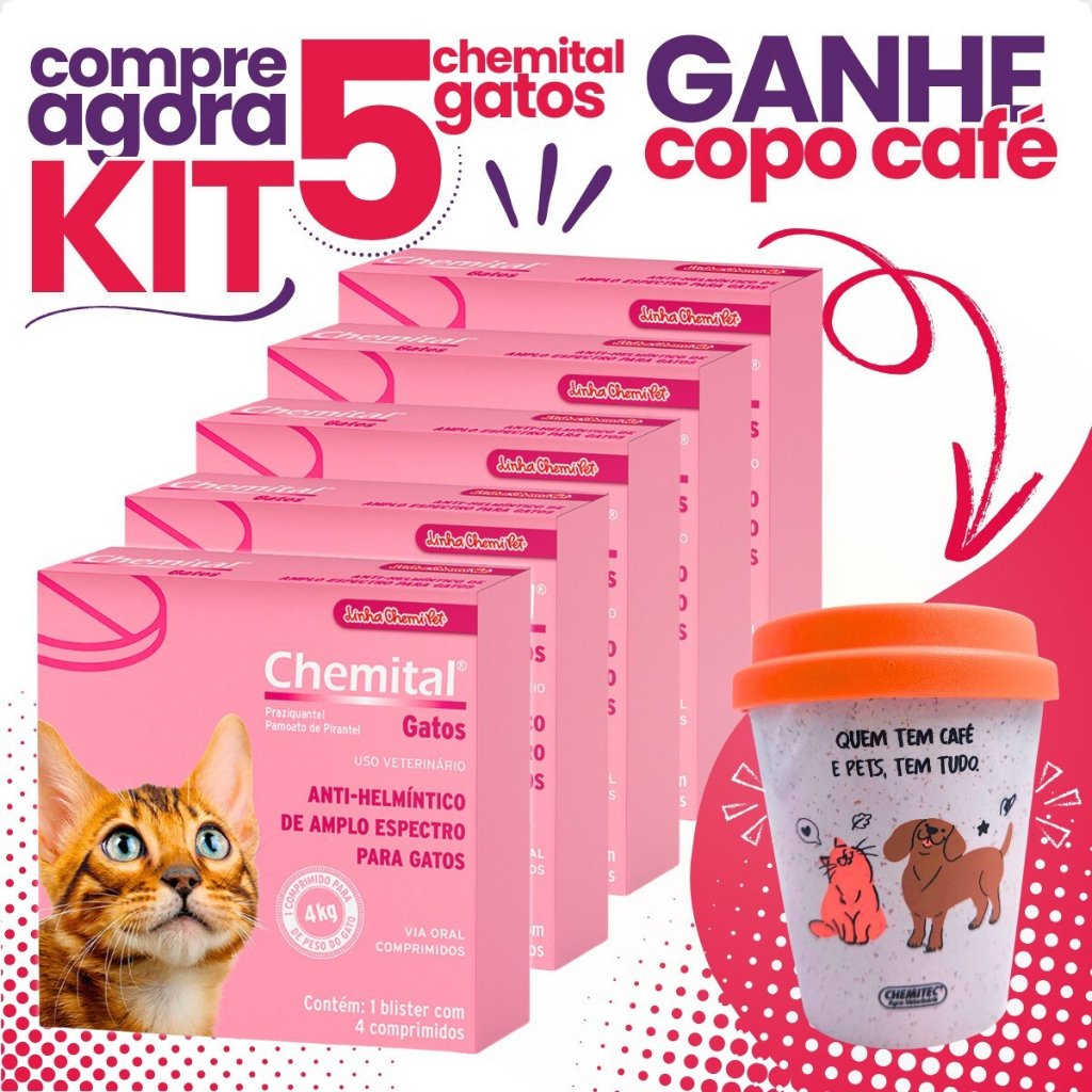🐾 Kit 5 Vermífugo Chemital para Gatos + Exclusivo Copo Café Pet ☕ ✅ Elimina vermes intestinais ✅ Uso seguro até para gatas prenhes ✅ Acompanha copo de café exclusivo! 😾 Gato com vermes? Chegou a solução completa para proteger a saúde do seu felino! O Chemital Gatos da Chemitec é um vermífugo de amplo espectro indicado para combater com eficácia cestóides, ancilostomídeos e ascarídeos — parasitas comuns que causam apatia, diarreia e perda de peso nos gatos. Com fórmula à base de Praziquantel e Pamoato de Pirantel, é seguro, eficaz e pode ser administrado até mesmo em gatas prenhes, em qualquer fase da gestação. 🎁 E tem mais! Na compra deste kit 5 Chemital Gatos, você ainda recebe um Copo de Café Pet exclusivo — perfeito para os apaixonados por pets! ✨ Benefícios do Chemital Gatos: - Combate vermes intestinais com eficiência - Fórmula segura: ideal também para gatas gestantes - Fácil de administrar: pode ser misturado à comida - Dispensa jejum ou cuidados prévios - Alta palatabilidade 📦 Kit contém: - 5 Caixas do Vermífugo Chemital para Gatos - 1 Copo Café Pet (exclusivo)