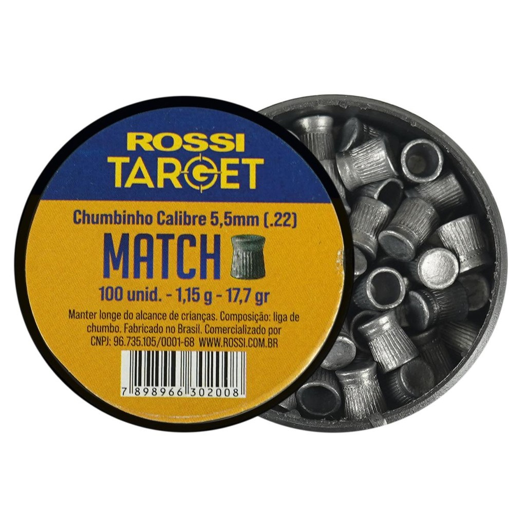 Produto de uso exclusivo em práticas esportivas. O uso do produto exige treinamento e equilíbrio emocional. Deverá ser guardado em lugar seguro e fora do alcance de terceiros. Os produtos aqui listados servem apenas para uso recreativo, ou seja ***NÃO*** letal. Esse é um Chumbinho produzido pela ROSSI, uma marca renomada no mercado com muitos anos de experiência nos ramos Esporte e Lazer. O Chumbinho Rossi TARGET MATCH é especialmente projetado para competições e práticas de tiro ao alvo. Ele possui uma cabeça plana, essa característica ajuda a melhorar a precisão e o agrupamento dos disparos, pois reduz a interferência do vento e melhora a estabilidade do projétil durante o voo. ESPECIFICAÇÕES TÉCNICAS: - Marca: Rossi - Modelo: Target Match - Calibre: 5.5mm (.22) - Quantidade: 100 unidades - Peso: 1,15 gramas - Gramatura: 17,7 grains - Comprimento: 6,7mm - Peso bruto total da lata: 109 gramas ITENS INCLUSOS: - 01 Lata de Chumbinho Rossi Target Match Calibre 5.5mm 100un. Observação: Garantia de 03 meses mediante a defeitos de fábrica. INFORMAÇÃO: Os equipamentos, peças e acessórios aqui listados são de uso exclusivo em armas de pressão (gás comprimido ou mola), airsoft, paintball, esferas plásticas (BBS) e estão em conformidade com a legislação brasileira de USO PERMITIDO "É permitido o uso de armas de pressão por ação de gás comprimido ou por ação de mola, com calibre igual ou inferior a seis milímetros (6mm ou 6.0mm), e das que lançam esferas de plástico com tinta, como os lançadores de paintball." Conforme parágrafo único do Art. 11 do DECRETO Nº 11.615, DE 21 DE JULHO DE 2023. A venda desses itens é feita somente para maiores de 18 anos mediante a comprovação de maior idade. Atenção: O envio de Armas de pressão e Airsoft é realizado somente por transportadora. Caso tenham dúvidas entrar em contato.