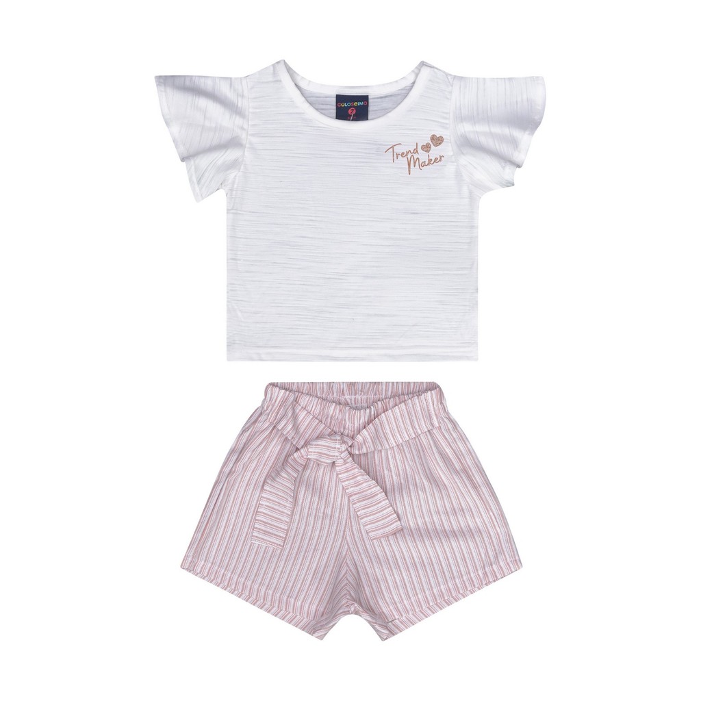 Conjunto infantil para menina, composto por blusa em meia malha flamê e shorts em algodão listrado, perfeito para um visual moderno e confortável. A blusa apresenta estampa com glitter e mangas evasê, adicionando brilho ao look. Com acabamento em debrum e bainha fina, a peça proporciona leveza e suavidade no uso. O shorts listrado vem com um cinto do próprio tecido, criando um detalhe estiloso e ajustável, além de contar com elástico na cintura para maior conforto. O conjunto é ideal para dias mais quentes, garantindo liberdade de movimento e estilo em qualquer ocasião.Tecido: Blusa: Meia Malha Flamê | Shorts: Tecido OxfordineComposição: Blusa: 50% Algodão e 50% Poliéster | Short: 100% AlgodãoModelagem: AmplaComprimento Mangas: CurtaModelo Mangas: EvasêComprimento: CurtoForro: NãoCintura: Média