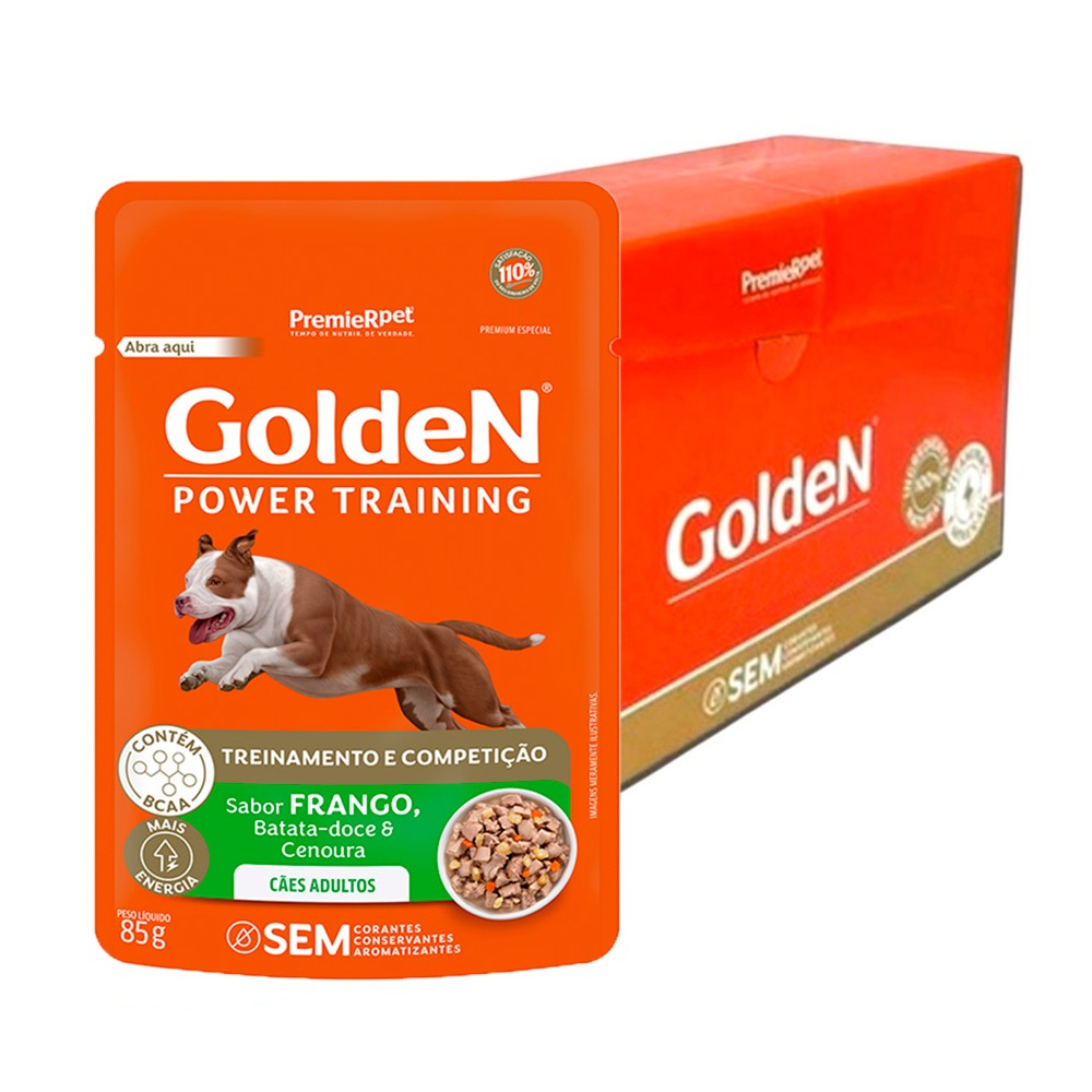 Ração Úmida Golden Power Training Cães Adultos Frango, Batata Doce e Cenoura 85g - Indicado para cães;- Ideal para cães adultos que praticam atividades físicas;- Possui BCAA (aminoácidos de cadeia ramificada);- Contém L-carnitina;- Rico em vitaminas e minerais. A Ração Úmida GoldeN Power Training Cães Adultos Frango, Batata doce e Cenoura é um alimento Premium Especial úmido completo indicado para cães adultos que praticam atividades físicas e necessitam de mais energia. Possui BCAA (aminoácidos de cadeia ramificada) e L-carnitina em sua composição, ingredientes que auxiliam na formação da musculatura e no restabelecimento físico após a realização de exercícios. Ingredientes Água, carne de frango, carne mecanicamente separada de frango, pescoço de frango sem pele, plasma sanguíneo desidratado de suíno, proteína isolada de soja, farelo de arroz desengordurado, batata-doce, cenoura, cloreto de potássio, cloreto de sódio, fosfato bicálcico, sulfato de condroitina, sulfato de glicosamina, goma guar, L-carnitina, vitamina A, vitamina B1, vitamina B2, vitamina B3, vitamina B5, vitamina B6, vitamina B7, vitamina B9, vitamina B12, vitamina C, cloreto de colina, vitamina D3, vitamina E, vitamina K3, cobre aminoácido quelato, óxido de magnésio, selenito de sódio, zinco aminoácido quelato.