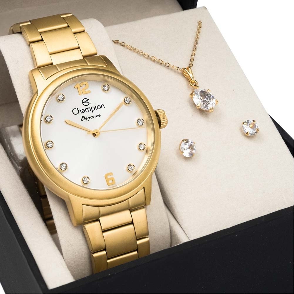 Relógio Dourado Fosco Champion Feminino Kit Colar e Brincos Original CN28437W - 5% OFF | Watches