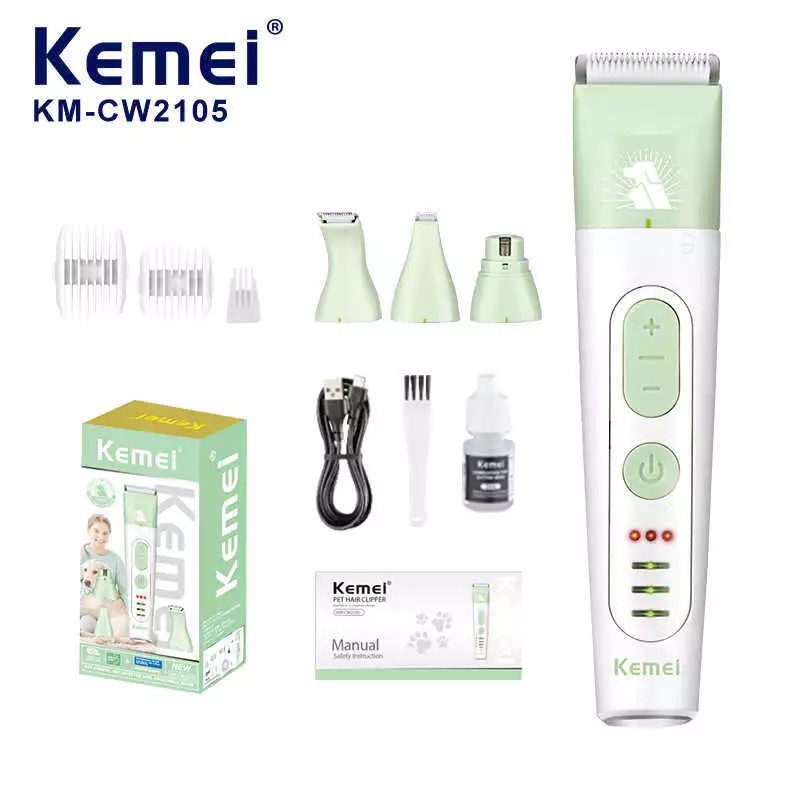 🐾 Kit de Tosa Kemei 4 em 1 KM-CW2105: O Seu Salão Pet em Casa! 5W DE POTÊNCIA 3 HORAS PARA CARREGAMENTO 180 MINUTOS DE USO BIVOLT SEM FIO Garanta o bem-estar e o visual impecável do seu melhor amigo com o Cortador Elétrico Profissional Kemei KM-CW2105. Projetado para cães e gatos, este kit completo oferece 4 funções essenciais para cuidados completos e práticos! ✨ Funções Essenciais 4 em 1 Este aparelho multifuncional é o seu aliado para manter seu pet sempre lindo e confortável: Aparador de Pelos Principal: Para tosa completa e eficiente do corpo (cães e gatos). Aparador de Pelos para Patas/Focinho: Cabeça menor, ideal para áreas sensíveis e detalhes (patas, ao redor dos olhos e focinho). Polidor/Lixador de Unhas: Suaviza e apara as unhas do seu pet de forma segura e indolor. Raspador de Pelo (Desembolador): Ajuda a remover pelos soltos e a desfazer nós leves. (Verificar se é essa a 4ª função do item, caso contrário, ajustar). ✂️ Características de Destaque Marca Confiável: Kemei – Qualidade e desempenho em cuidados pessoais, agora para seus pets. Modelo: KM-CW2105. Design Ergonômico: Fácil de segurar e manusear, proporcionando mais controle durante a tosa. Carregamento USB: Praticidade total! Recarregue em qualquer porta USB (computador, power bank, etc.). ⚙️ Especificações CaracterísticaDetalheModeloKM-CW2105IndicaçãoCães e Gatos (Profissional e Uso Doméstico)Fonte de Energia Carregamento USB Material da Carcaça Plástico Resistente Cor(A cor do modelo KM-CW2105) Tipo de Produto Kit 4 em 1: Cortador, Aparador, Polidor de Unhas🎁 Conteúdo da Embalagem 01 - Máquina Principal Kemei KM-CW2105 (Demais cabeças/acessórios, como os 4 mencionados, cabo USB e escova de limpeza).