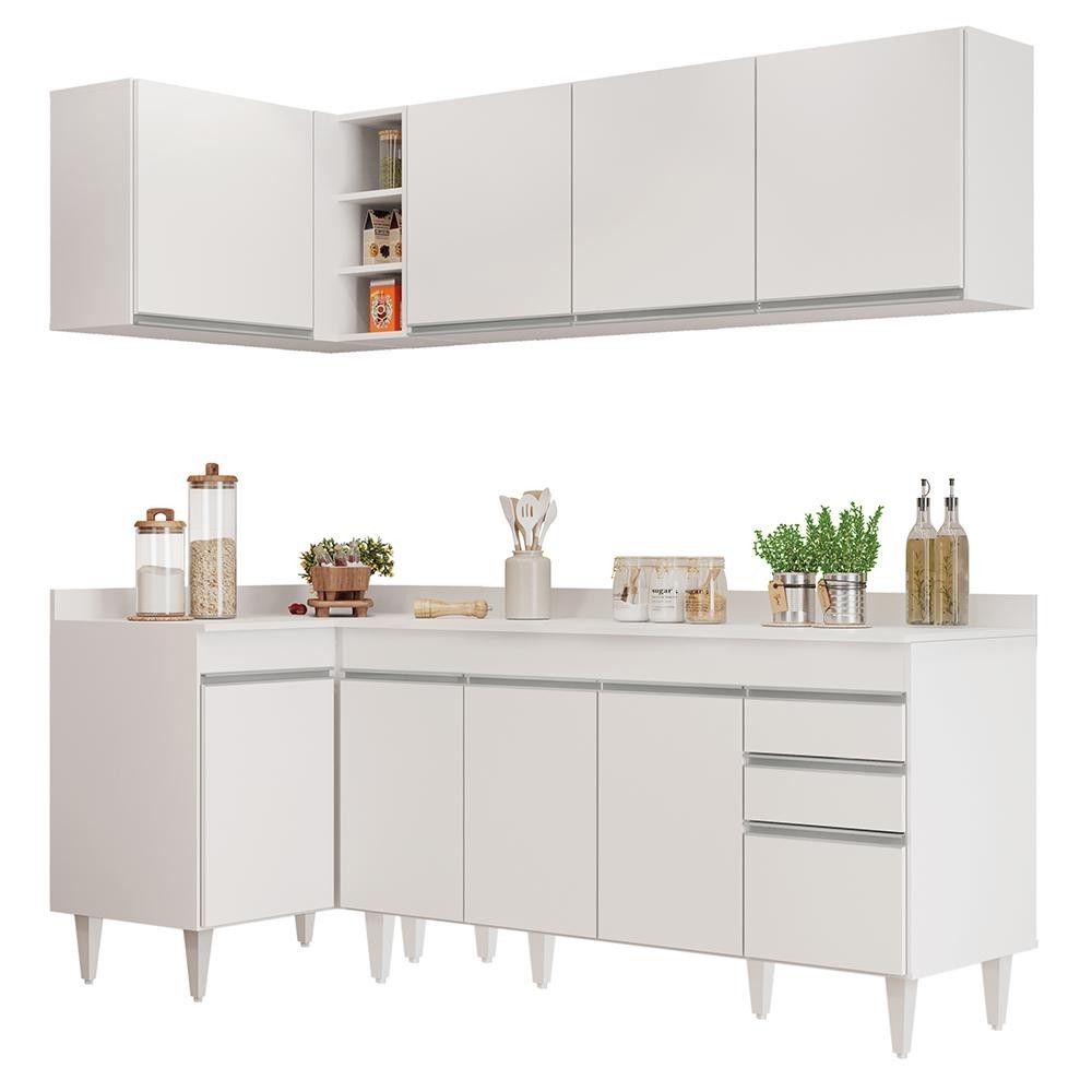 Além de ser composto por peças essenciais, como balcão para pia 150cm, balcão de canto e armários aéreos, esse jogo de cozinha ainda conta com uma maior resistência contra riscos e umidade, garantindo sua durabilidade por muito tempo, graças ao acabamento em BP. Já os pés ajustáveis permitem você nivelar o móvel em qualquer tipo de piso. Para completar, o design contemporâneo dessa cozinha de canto se adapta facilmente a qualquer estilo de decoração, ao passo que essa configuração otimiza a circulação no ambiente. Bom demais, não é mesmo?!