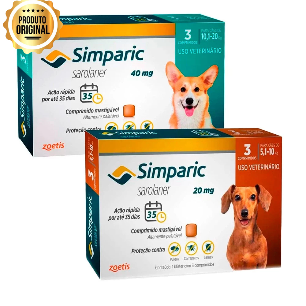 – Indicado para cães; – Kit com 1 unidade de Simparic de 5,1 a 10kg e Simparic de 10,1 a 20kg com 3 Comprimidos cada; – Controle de pulgas e carrapatos; – Combate também três tipos de sarnas: Sarcópticas, Demodécica e Otodécica. O simparic ajuda também a combater até três tipos de sarna a Sarcópticas, Demodécica e Otodécica, tem fácil aceitação pelos cachorros pois os comprimidos são palatáveis e saborosos. O antipulgas é ideal para cães a partir de 8 semanas de idade, é importante administrar o comprimido conforme o peso corpóreo do pet. Modo de usar Administrar via oral, 1 comprimido por mês. Simparic é um comprimido mastigável, sendo altamente palatável, podendo ser administrado com o sem alimentos. Sua fórmula age contra as pulgas resistentes, pode ser utilizado como parte do tratamento estratégico para controle de dermatite alérgica a picada de pulgas (DAPP).
