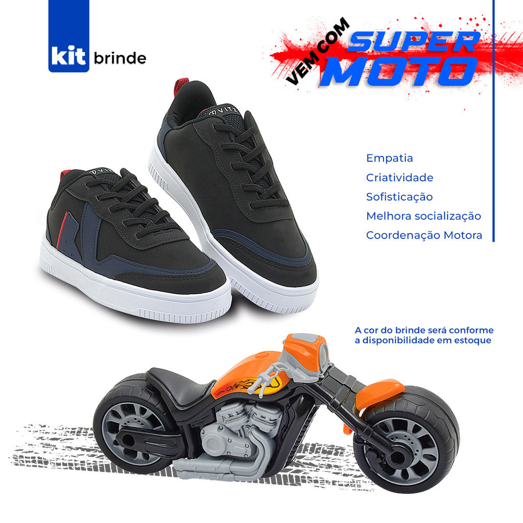 Tênis Infantil Menino Fly Preto/Marinho | Vitz + Brinde Este tênis infantil Vitz é a escolha ideal para os pequenos que adoram combinar estilo e conforto. Com um design moderno e sofisticado, ele oferece um ajuste seguro e confortável, perfeito para acompanhar as aventuras do dia a dia. O tênis é fácil de calçar e feito com materiais de alta qualidade que garantem durabilidade e resistência. Além disso, este kit inclui uma super moto de brinquedo, que promove a criatividade e a coordenação motora das crianças. Com cores vibrantes e um design atraente, a moto é o complemento perfeito para momentos de diversão e aprendizado. A cor do brinde pode variar conforme a disponibilidade em estoque, tornando a experiência de compra ainda mais emocionante. Medida aproximada dos pés para cada numeração: Tamanho 29 --- 18.8 cm Tamanho 30 --- 19.5 cm Tamanho 31 --- 20.2 cm Tamanho 32 --- 20.8 cm Tamanho 33 --- 21.5 cm Tamanho 34 --- 22.2 cm Tamanho 35 --- 22.8 cm Tamanho 36 --- 23.5 cm